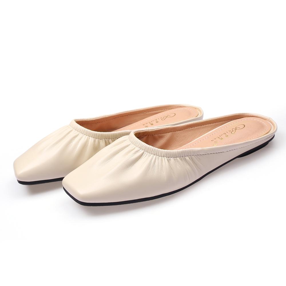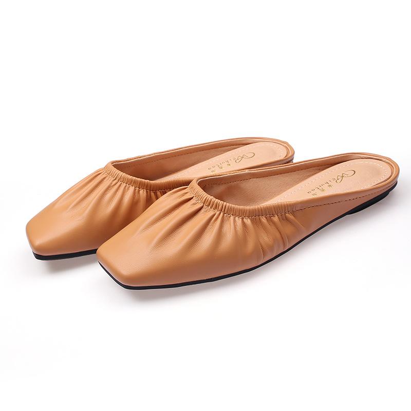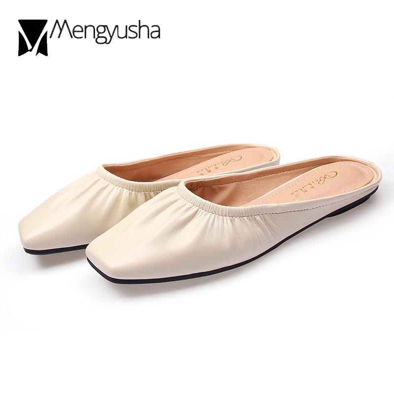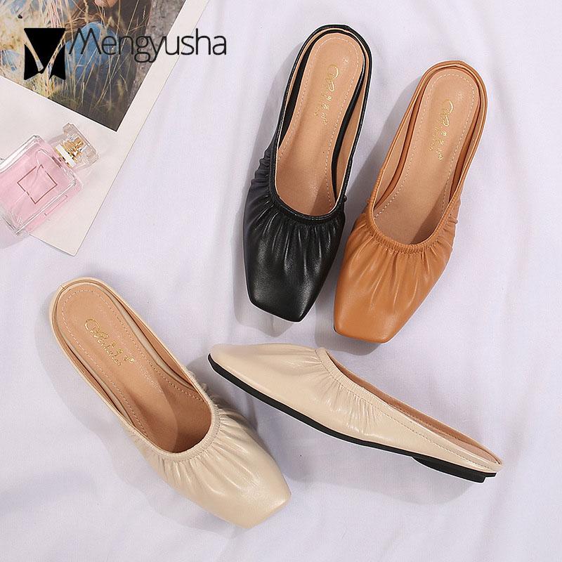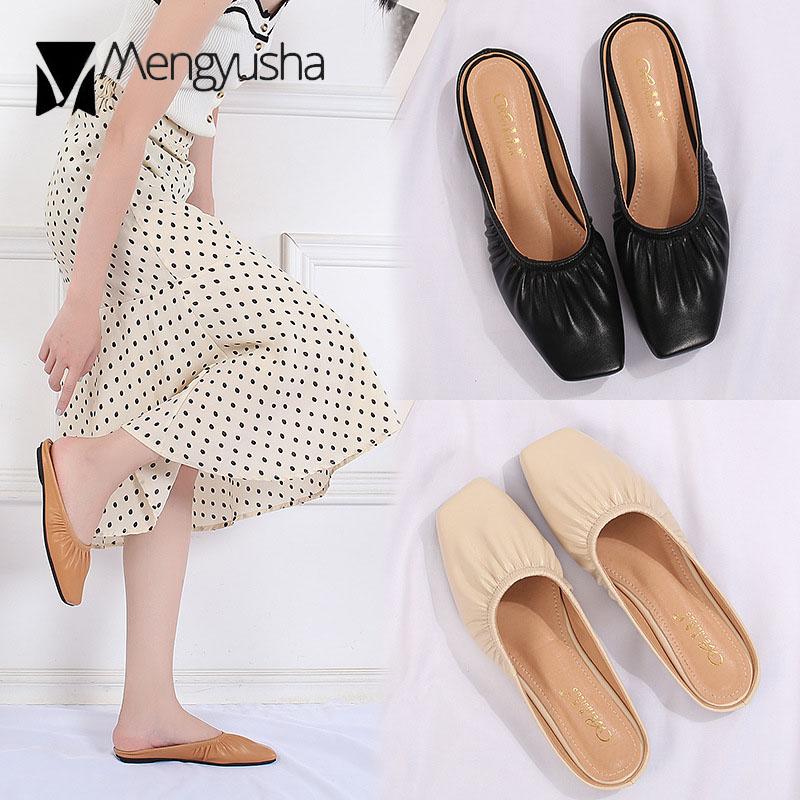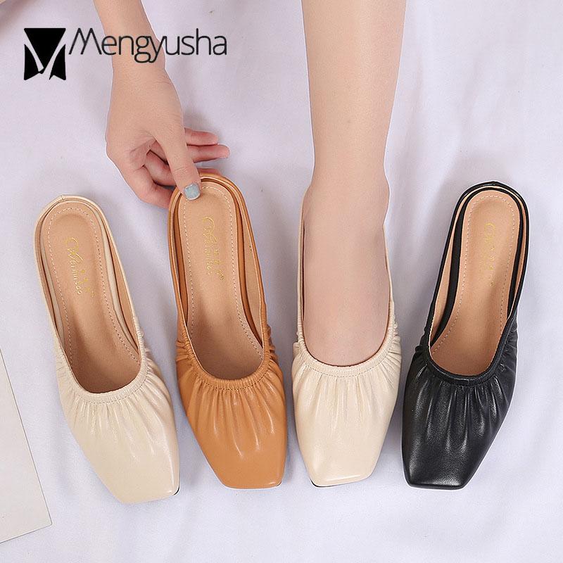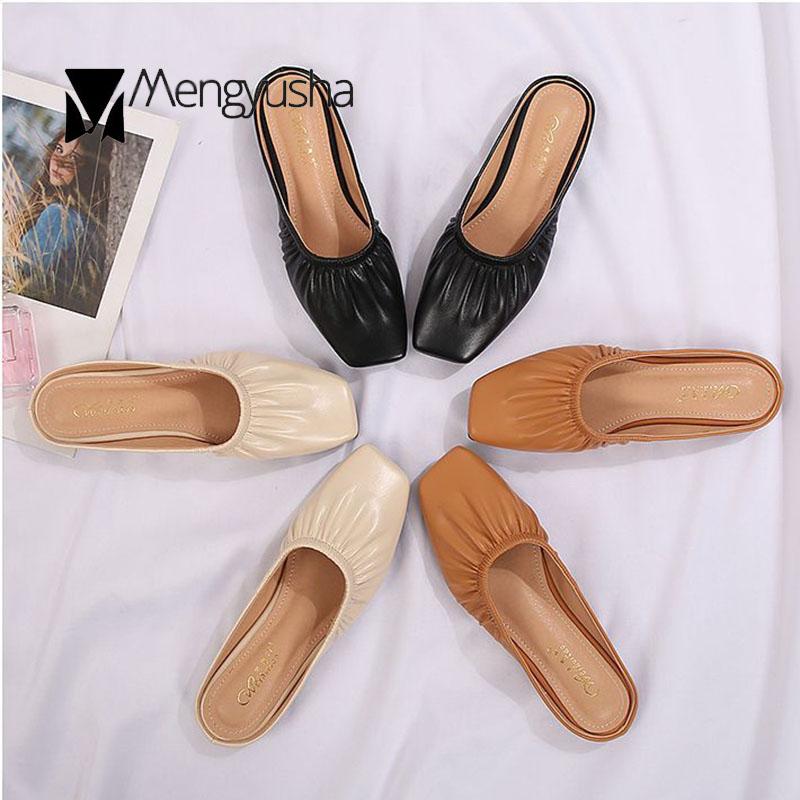 Модные мюли с квадратным носком, женские плиссированные тапочки из искусственной кожи, женские сандалии, пантуфли, женские туфли на плоской подошве, закрытые носки, большой размер