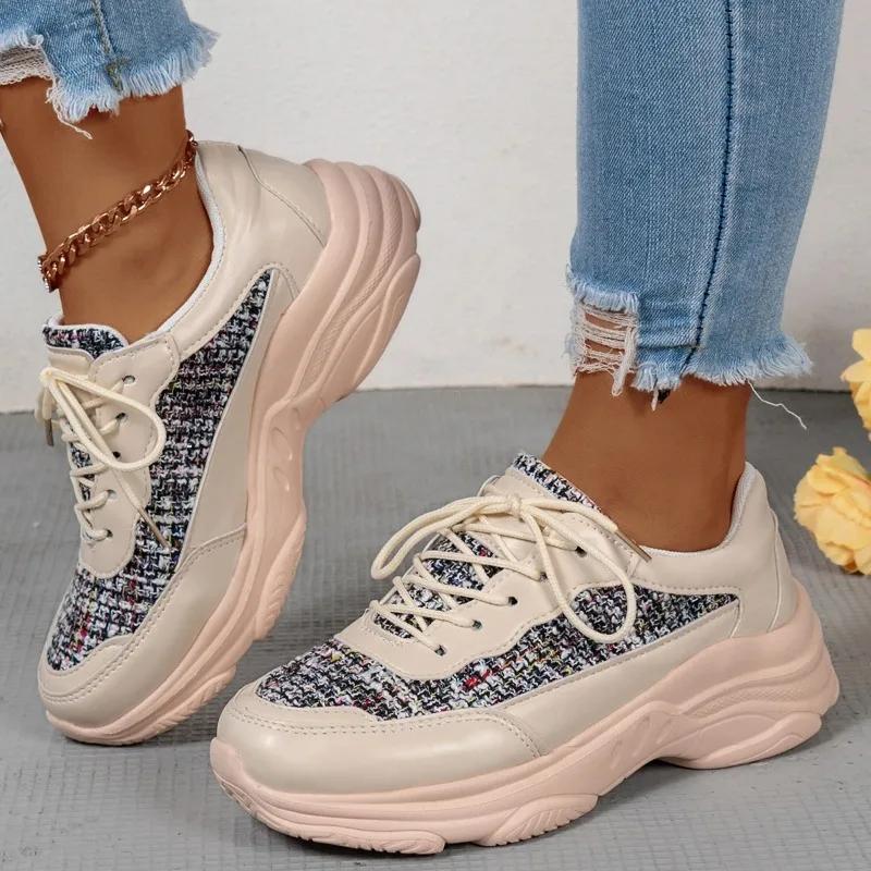 Модные повседневные шикарные женские кроссовки на весну со шнуровкой, нескользящие, с толстой подошвой, удобные спортивные туфли из искусственной парусины, туфли на платформе в стиле пэктворк