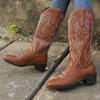 Модные ковбойские сапоги в стиле вестерн с острым носком и толстым каблуком для женщин, ретро-ботинки с V-образным вырезом и вышивкой, коричневые рыцарские ботинки, женская обувь