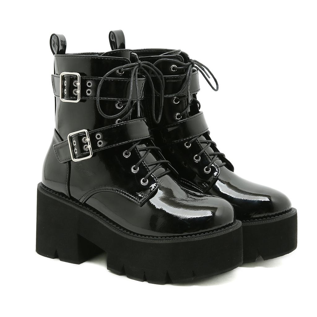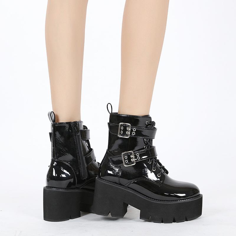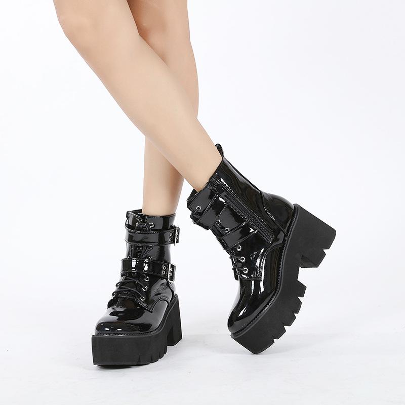 Модные женские кружевные осенние ботинки женские дамские ботильоны на толстой танкетке черные лакированные кожаные ботильоны панк-готика новое поступление 2024 г.