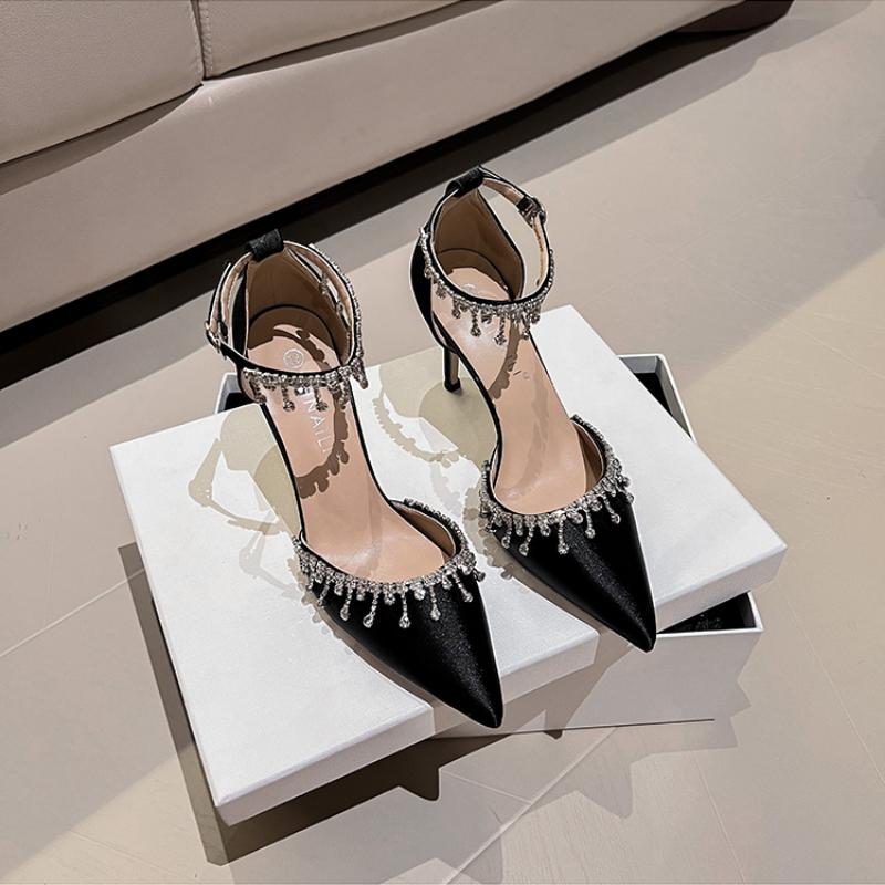 Белые свадебные туфли с атласной лентой в одну линию, женские летние модные туфли с цепочкой и кисточками на высоком каблуке, черные темпераментные полые сандалии