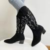 Сапоги женские ковбойские сапоги в стиле вестерн для женщин с острым носком женские туфли из тисненой замши кожаные ботинки до середины голени на толстой танкетке