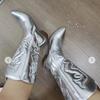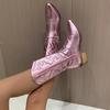 Ковбойские сапоги в стиле вестерн для женщин, блестящие металлические женские туфли с вышивкой до колена на шпильках с острым носком розового цвета для дропшиппинга