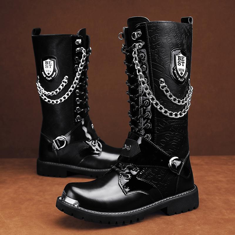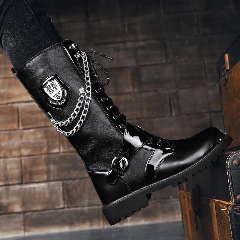 Модные мотоциклетные ботинки из искусственной кожи, однотонные, устойчивые к ударам, с завязками на носке, с боковой молнией, с цепочкой, с высокими мужскими ботинками