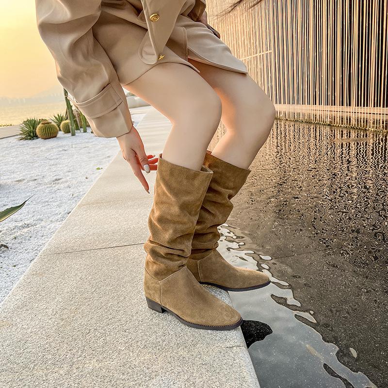 Модные женские сапоги, замшевые коричневые длинные сапоги на высоком каблуке, ковбойские сапоги с морщинами, 2024, модная женская дизайнерская обувь, высокие сапоги до бедра