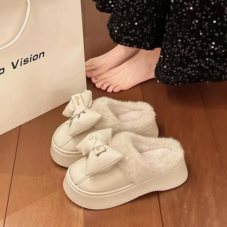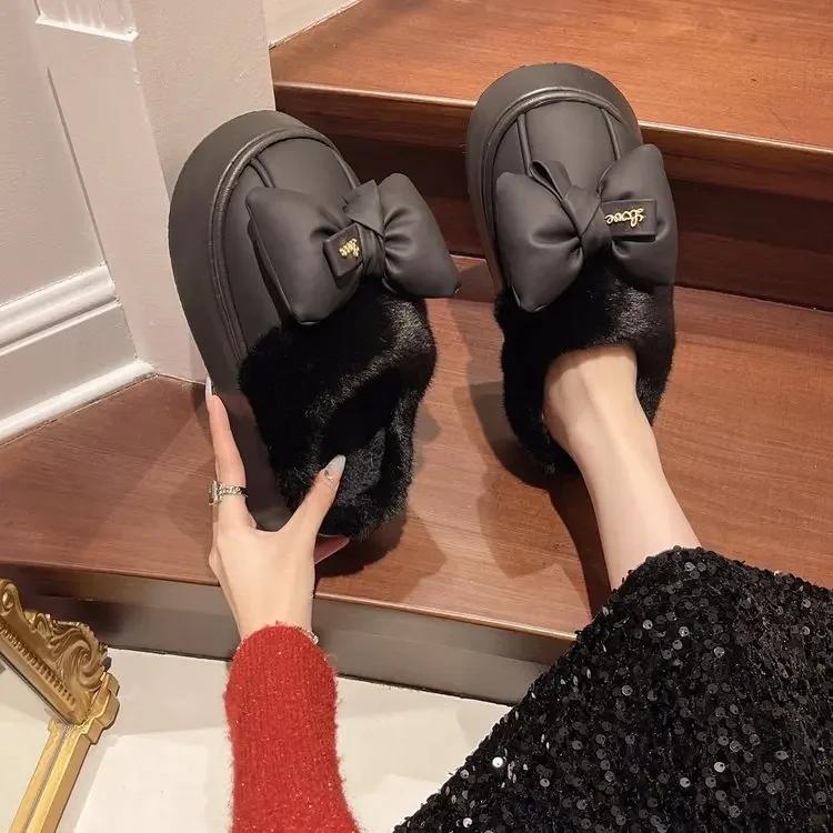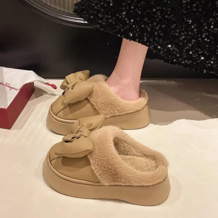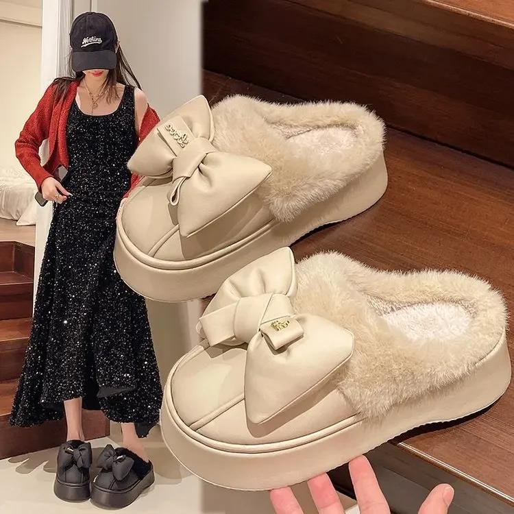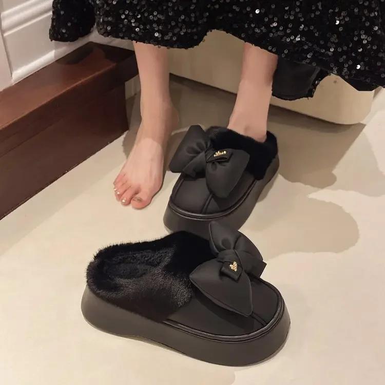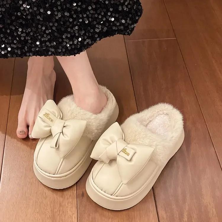 2024 Новые хлопковые тапочки женские осенне-зимние модные с бантом водонепроницаемые плюс ворс толстый низ увеличение сопротивления хлопка