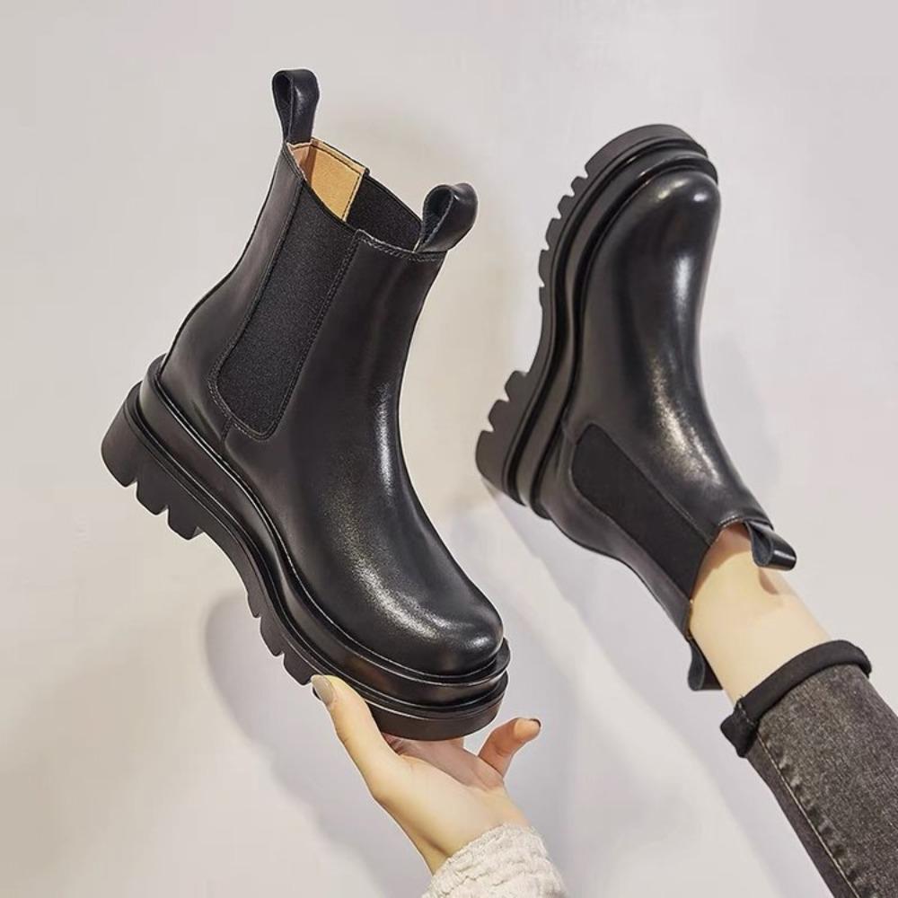 Классические ботинки челси женские черные ботильоны осень-зима 2024 кожаные короткие ботинки на платформе с эластичной резинкой
