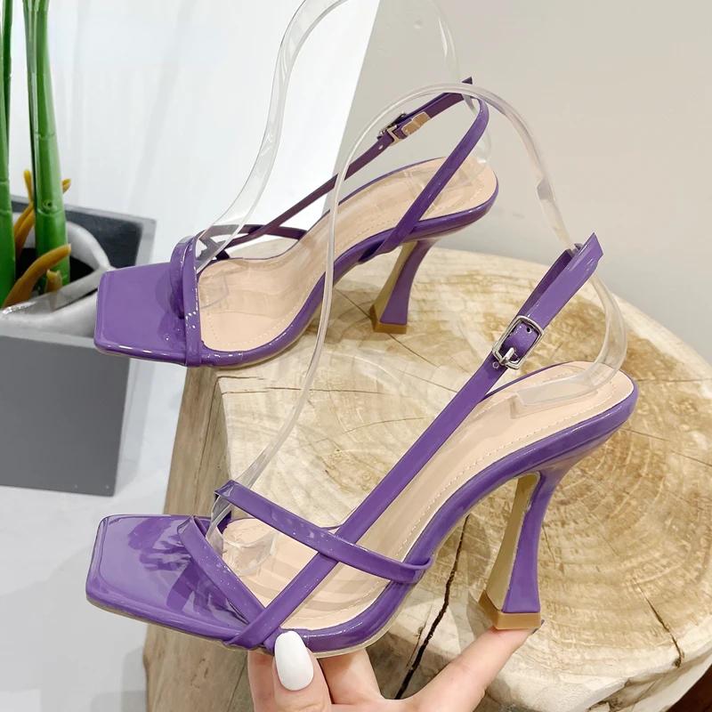 Модные летние босоножки 2024 года, женские модные туфли с квадратным носком и пряжкой на ремешке, лакированные босоножки на каблуке