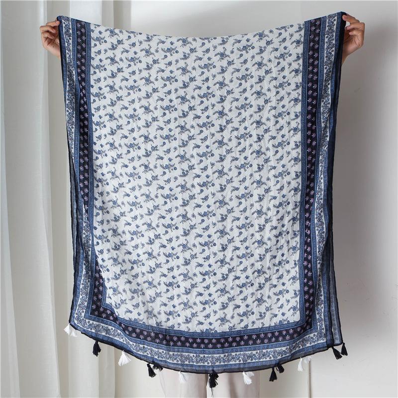 Осенне-зимняя сине-белая фарфоровая цветовая гамма Шарф с мелким цветочным узором Шарф в этническом стиле Женский универсальный шарф Теплая шаль из хлопка и льна