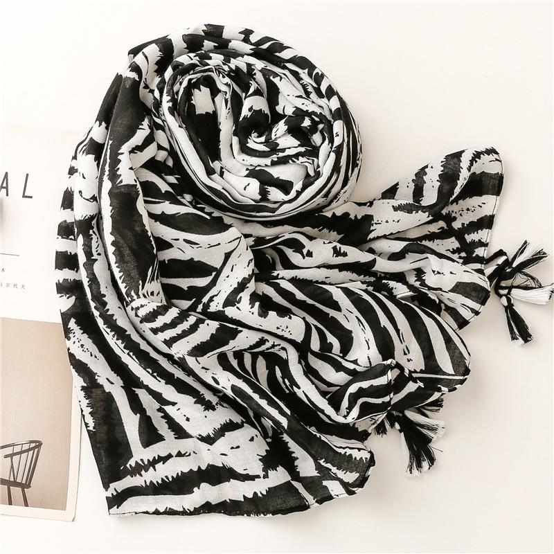 Европейский и американский хлопок и лен на ощупь плотный атласный хлопковый шарф женская линия черно-белый зебровый узор украшение кисточка шарф шаль