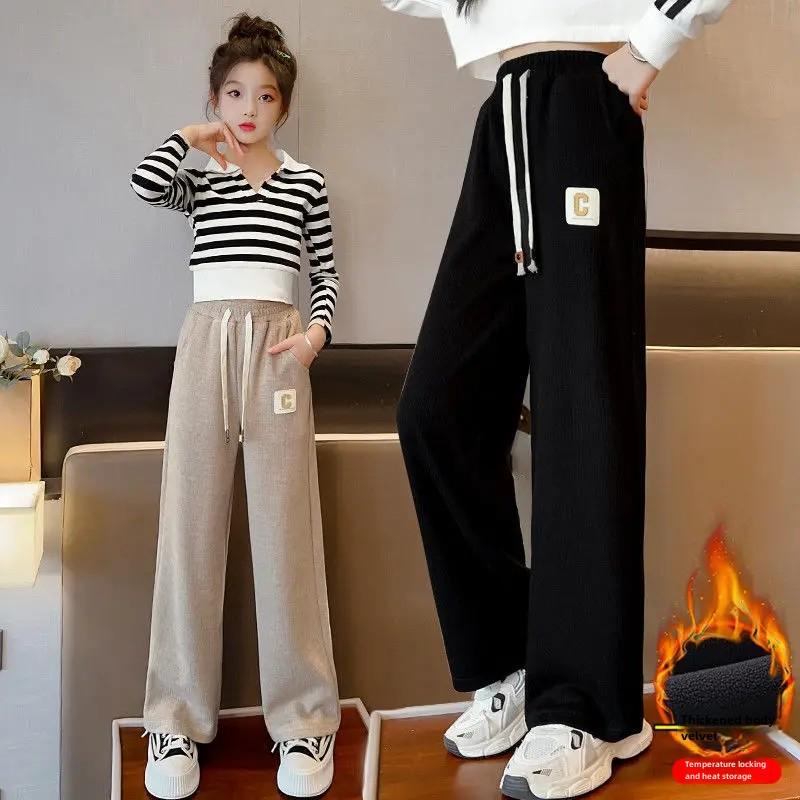 Утепленная верхняя одежда на флисовой подкладке для девочек, брюки повседневного покроя, универсальные детские брюки, новинка 2024 года, весна/осень