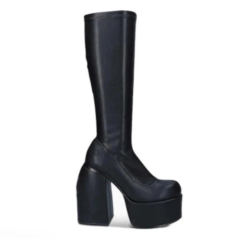 Модные женские сапоги Chelsea Long на толстой платформе с высокими каблуками, женские осенне-зимние мотоциклетные сапоги до колена, панк-обувь, женские сапоги