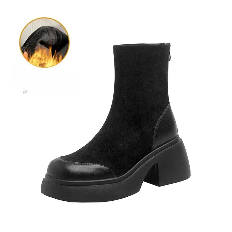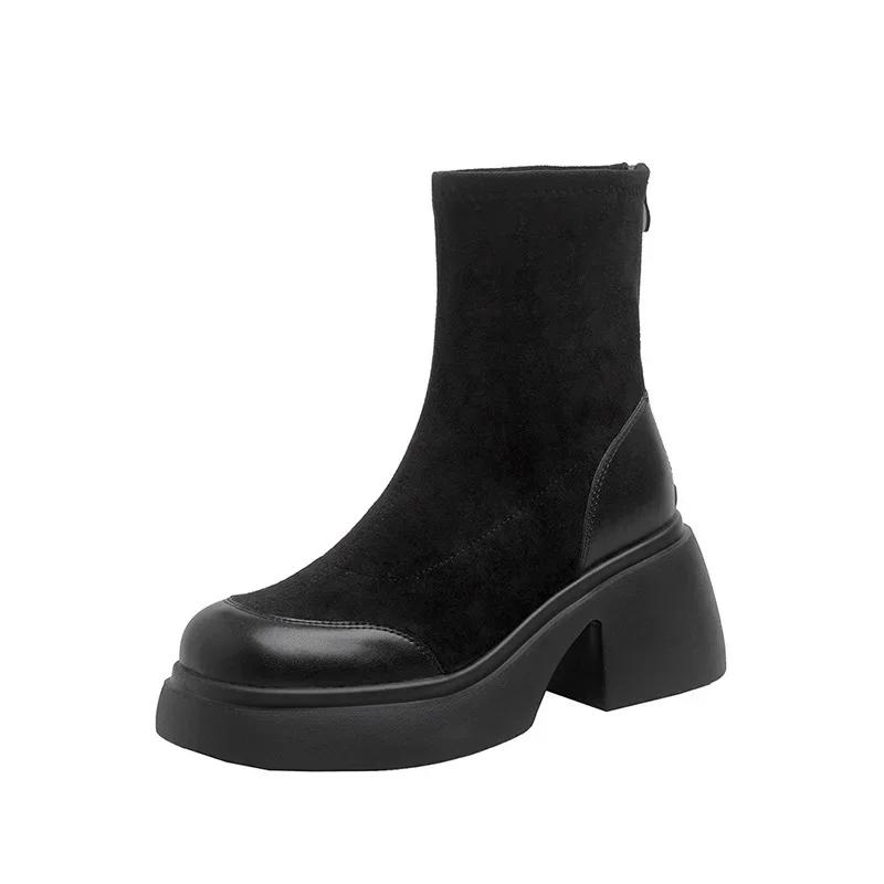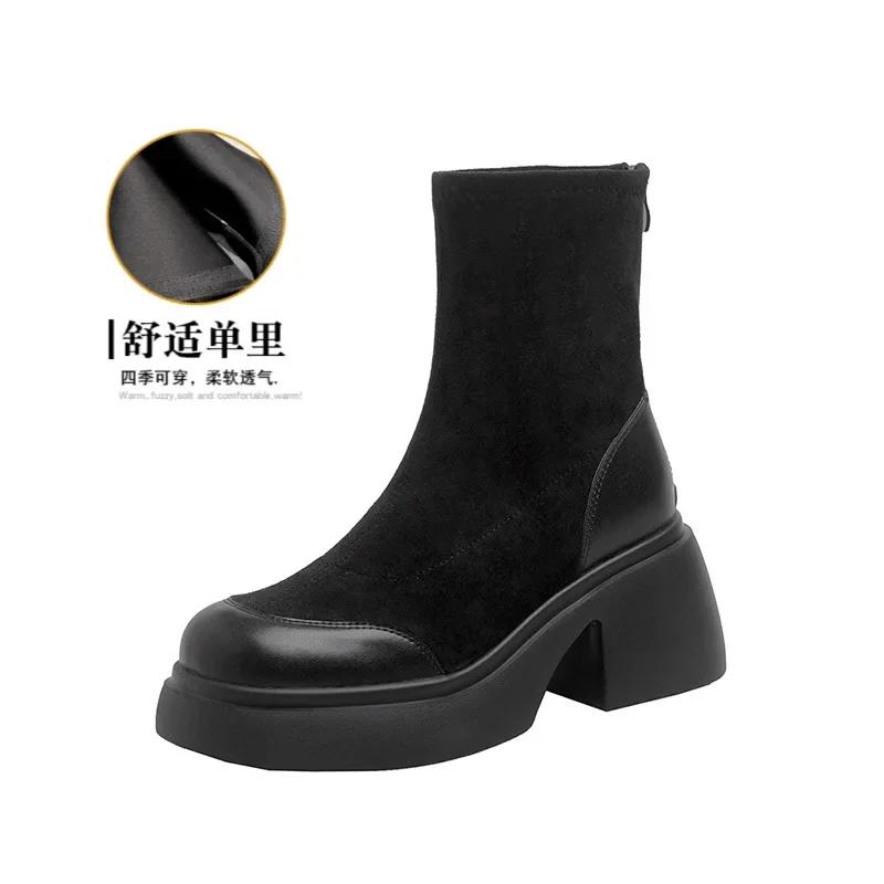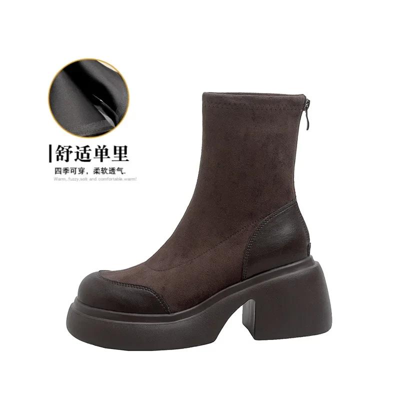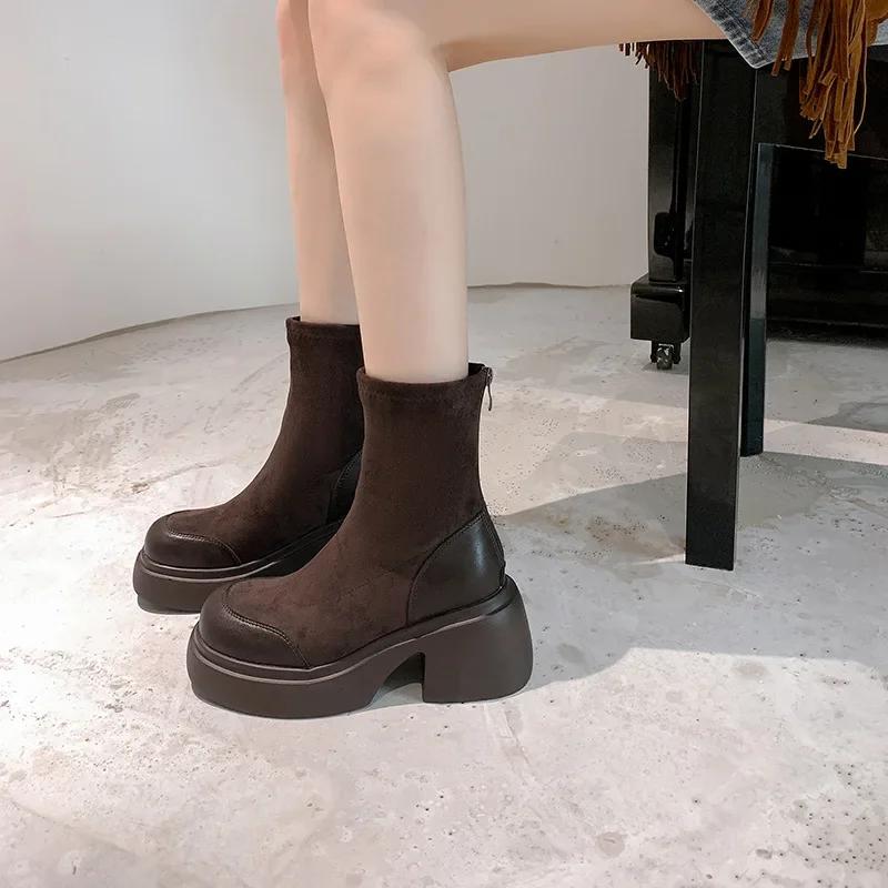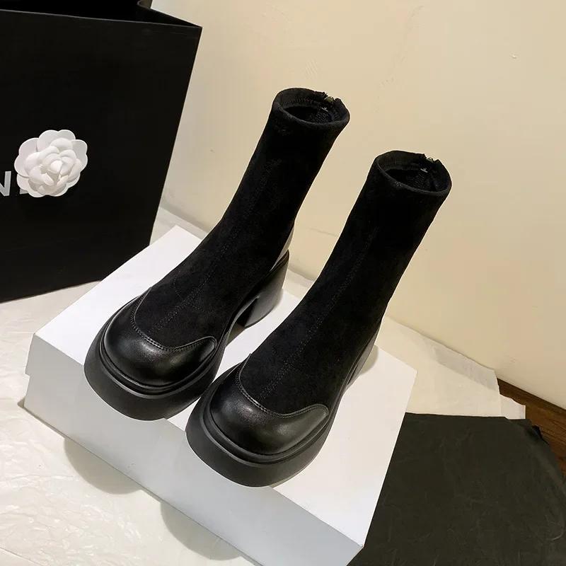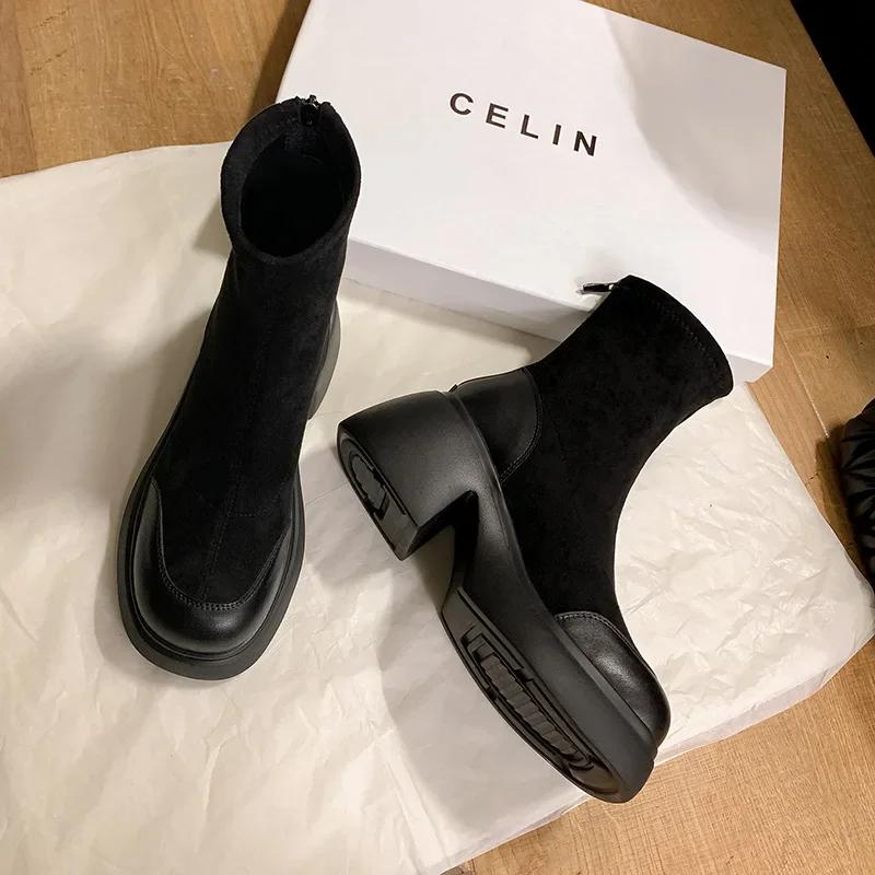 Модные женские осенне-зимние новые модные универсальные толстые подошвы на высоком каблуке эластичные короткие сапоги 2024 женские круглые ретро-ботфорты