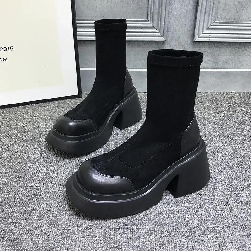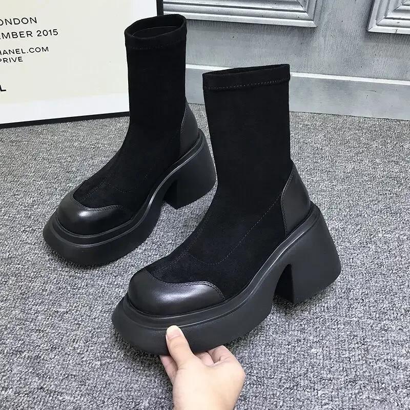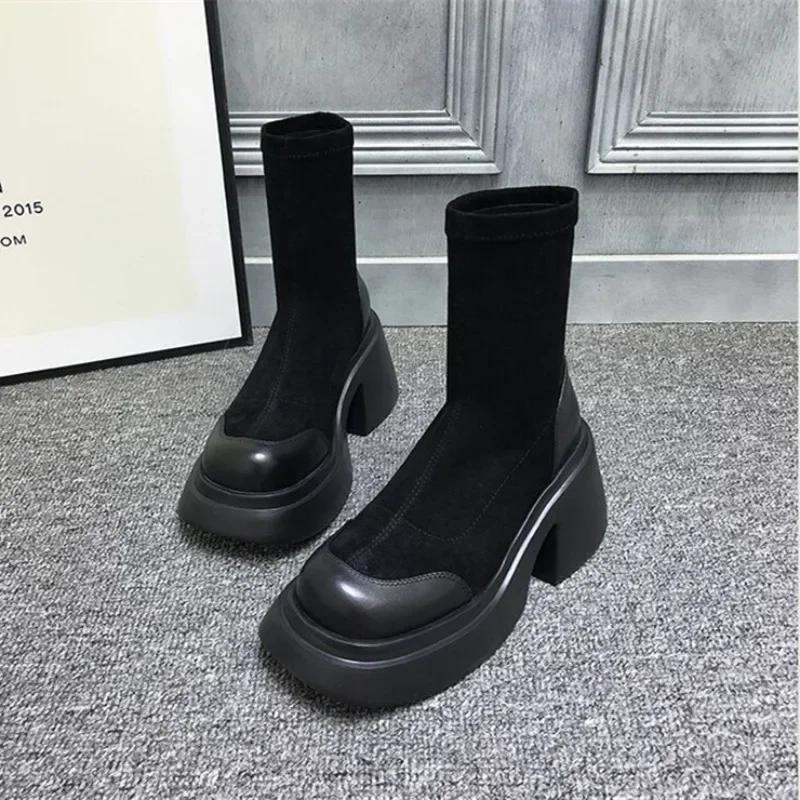 Модные женские эластичные ботильоны на платформе с высоким каблуком, квадратный носок, короткие сапоги, черные сапоги до колена, теплые зимние сапоги из плюша, Botines Mujer