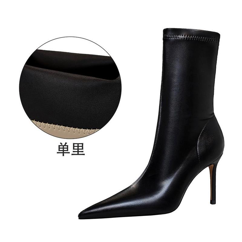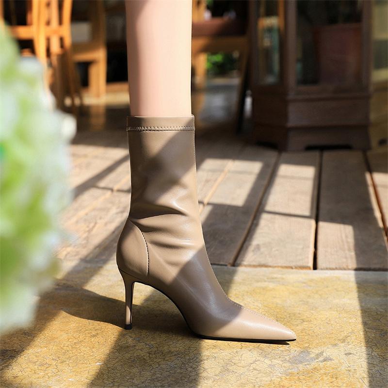Модные женские модные простые однотонные сапоги до середины голени с острым носком из искусственной кожи на тонком высоком каблуке для зрелых современных коротких сапог