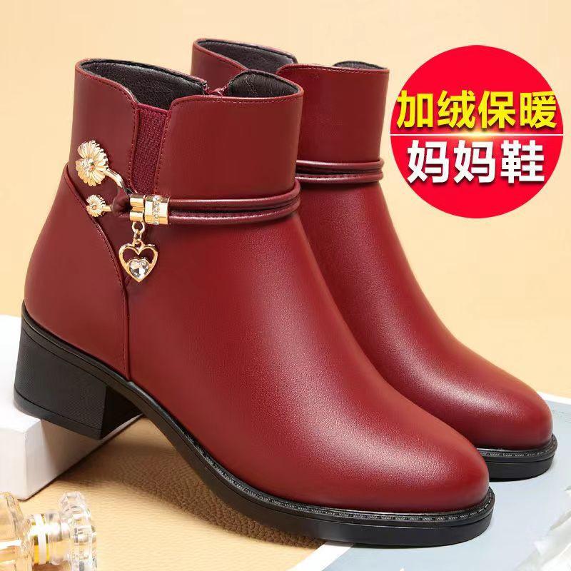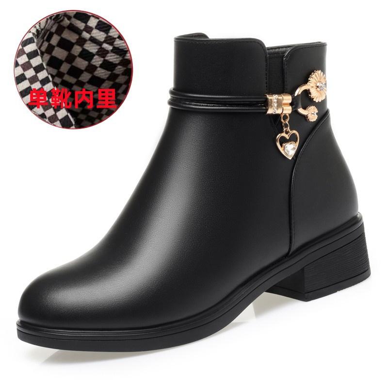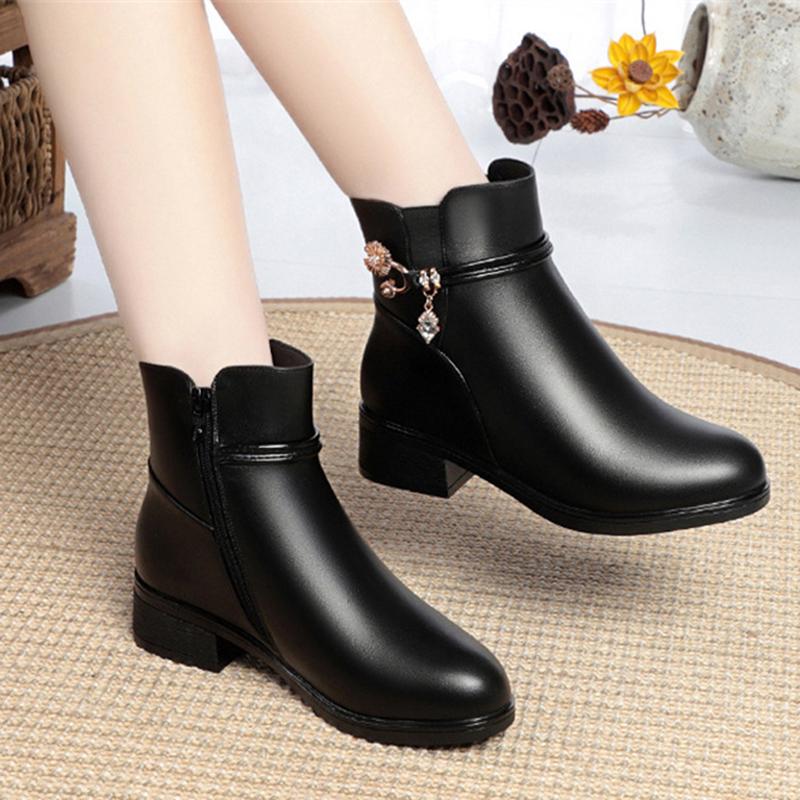 Модные женские ботинки из мягкой кожи на толстом каблуке 2024 года, весна-зима, толстая шерстяная подкладка, нескользящие, мягкие, однотонные, зимние, ботильоны