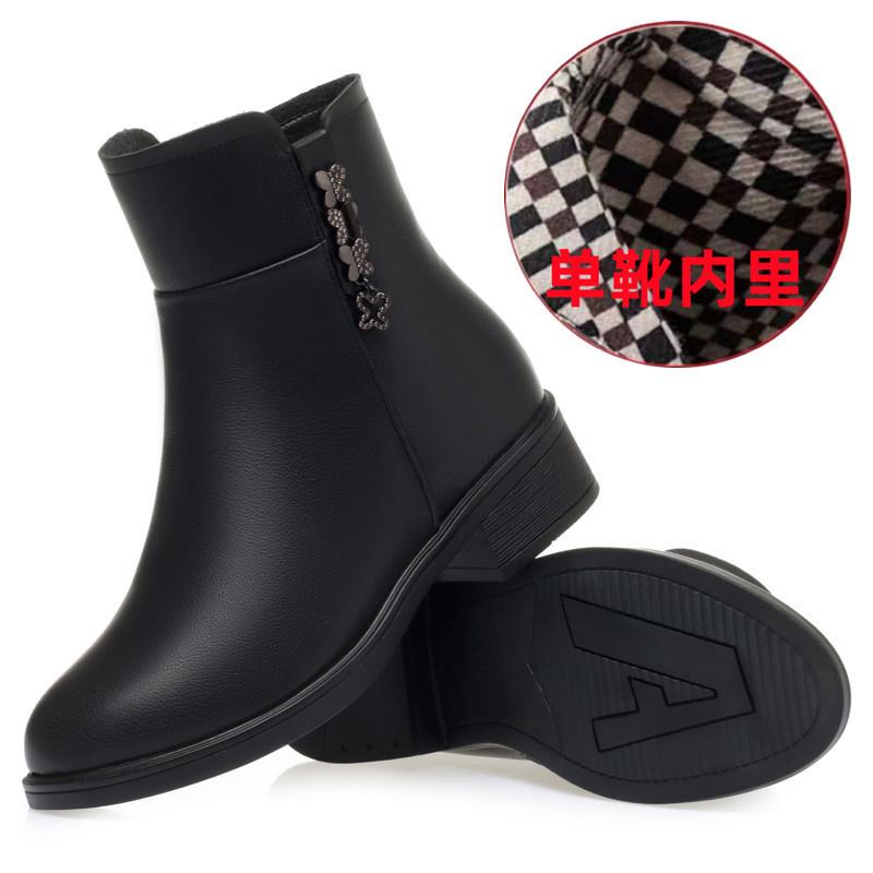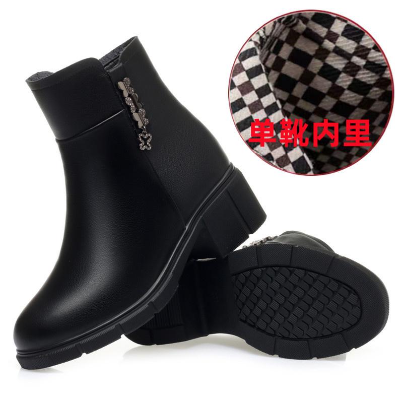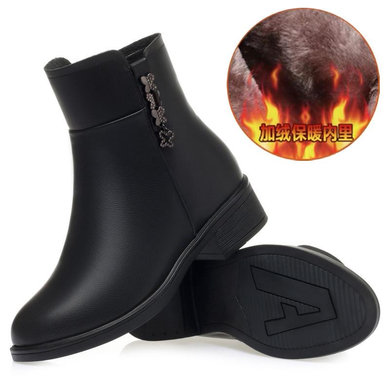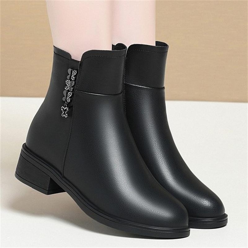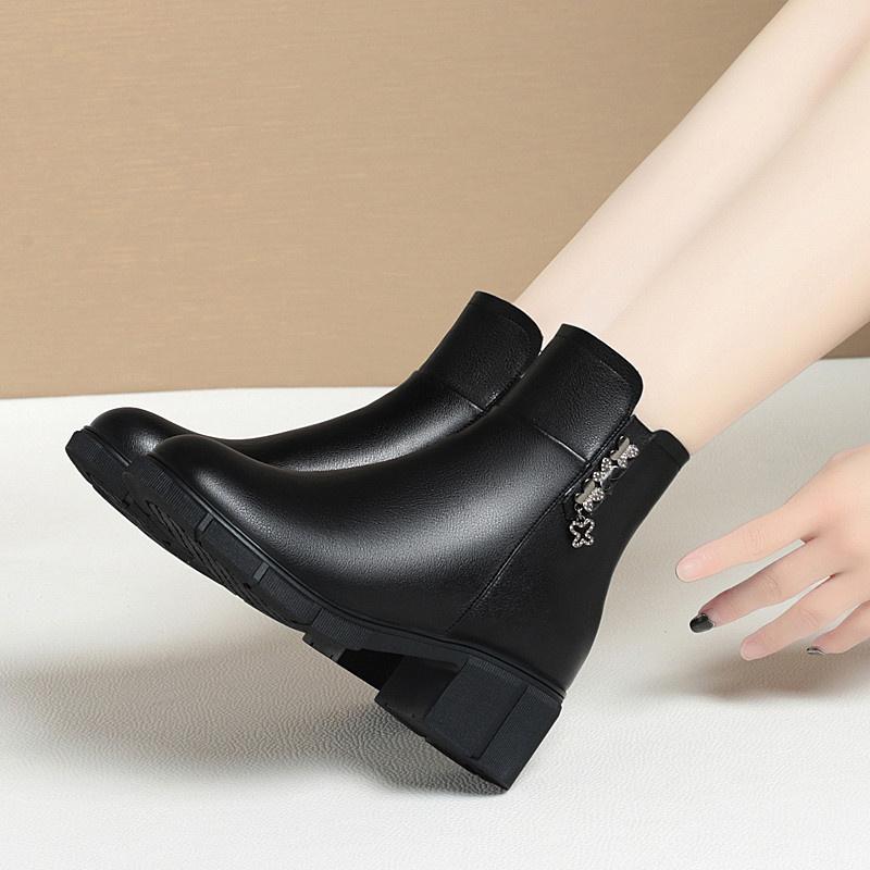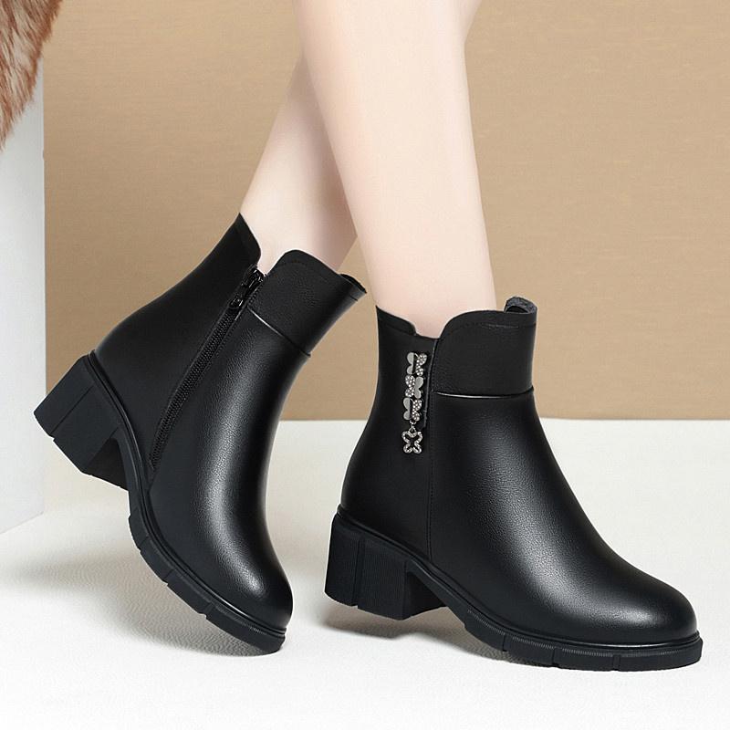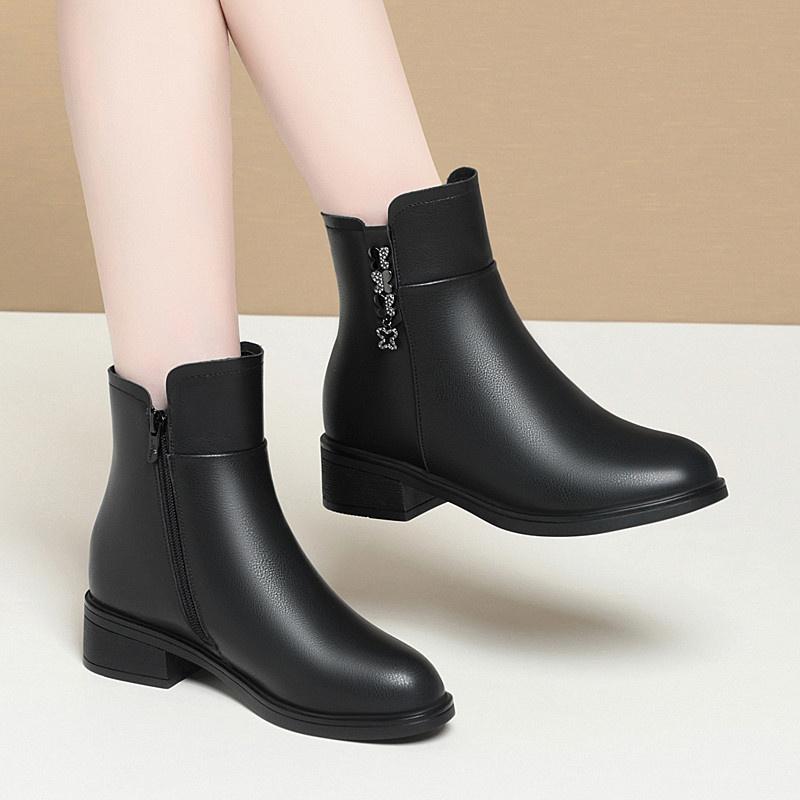 Модные зимние лаконичные толстые каблуки нескользящие водонепроницаемые мягкие кожаные хлопковые туфли удобные круглые черные ботильоны с боковой молнией