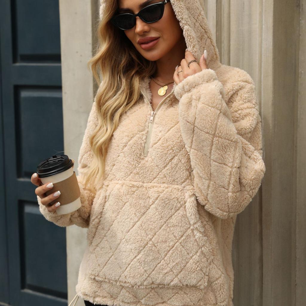 Двусторонний плюшевый флис - супермягкий и пушистый материал из полиэстера и шерпы. Эта женская толстовка с капюшоном из шерпы определенно согреет вас в течение всего дня! Наша объемная женская толстовка с капюшоном из шерпы — просто необходимая вещь этой зимой.