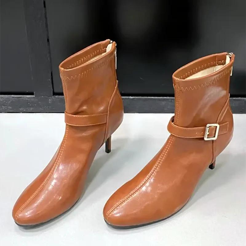 Модные роскошные мягкие кожаные ботильоны женские 2025 модные туфли на тонком высоком каблуке с круглым носком для женщин с застежкой-молнией на ремне и пряжкой дизайнерские эластичные ботинки
