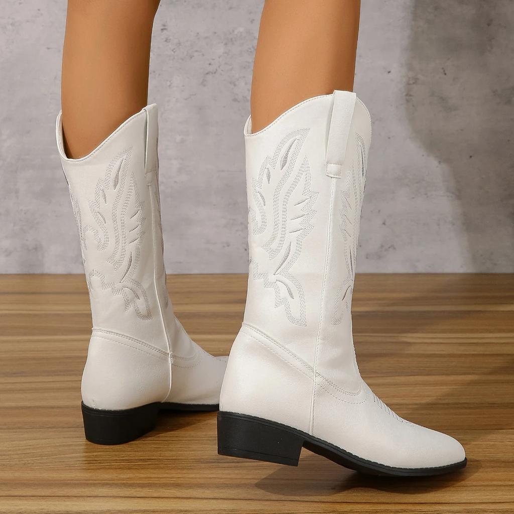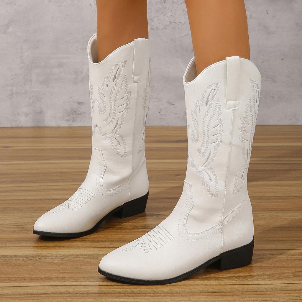 Модные вышитые белые сапоги в стиле вестерн, женские осенние новые ковбойские сапоги на высоком каблуке, женские сапоги большого размера 43 с острым носком и средней посадкой