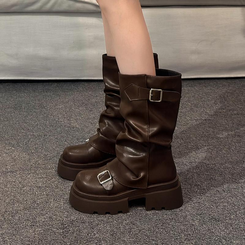 Мода 2024 года, горячая распродажа, новые женские ботинки до середины голени с круглым носком и толстым каблуком, однотонные износостойкие ботинки для женщин, Botines Mujer