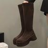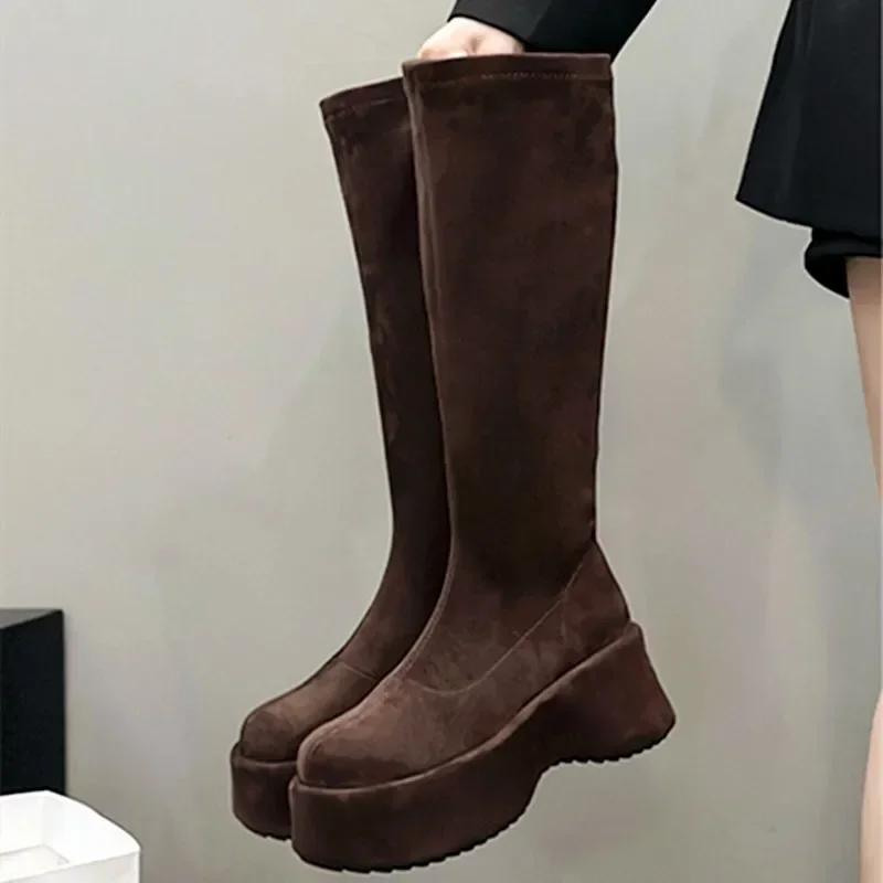 Модные зимние замшевые теплые сапоги до колена 2025 года, женские модные сапоги на танкетке и платформе, нескользящие, с толстой подошвой, увеличивающие рост, эластичные рыцарские сапоги