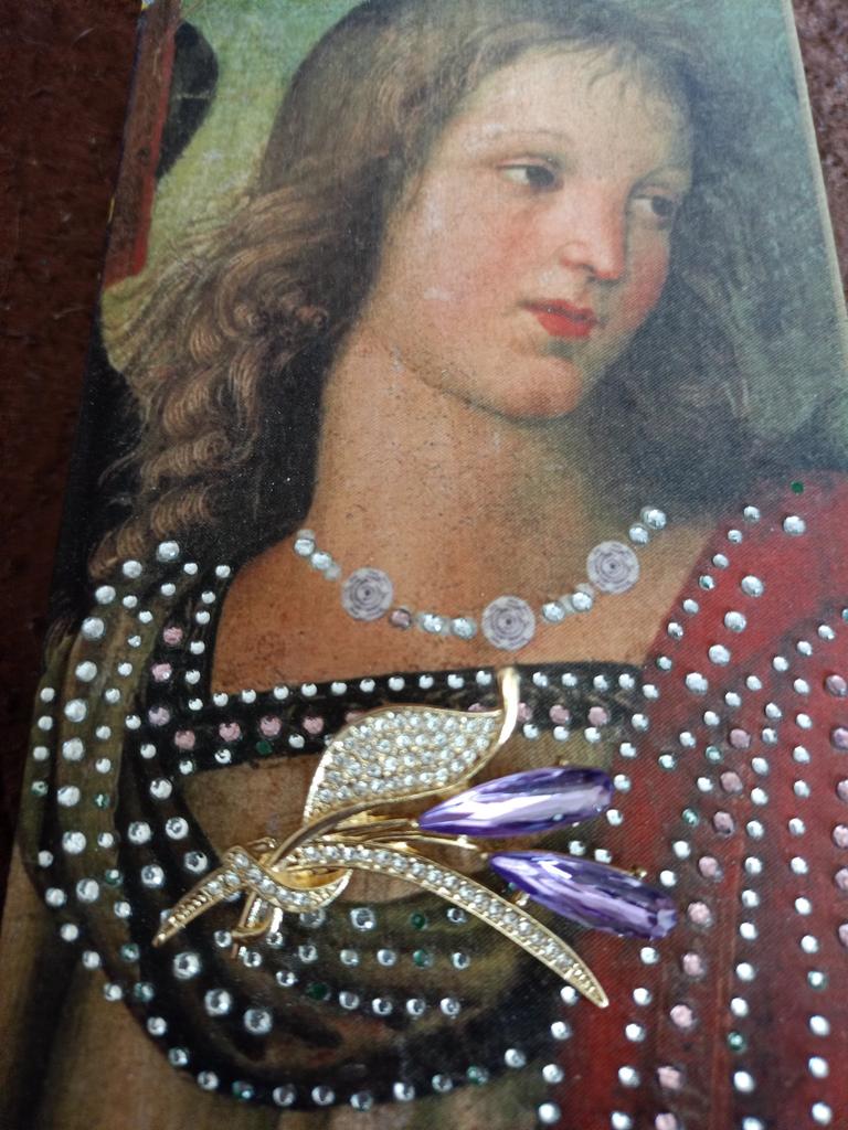 Замечательная брошь!!! Среднего размера, не тяжёлая, в некоторых местах такое впечатление, что камешки закрашены, но ее это совсем не портит. Очень понравилась. Производителю успехов и процветания!!! Спасибо!!!