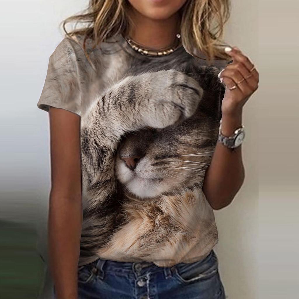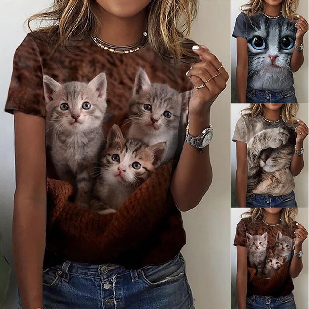 Женские топы с круглым вырезом, футболка с короткими рукавами, футболка с принтом кошки, рубашки-туники, винтажные топы