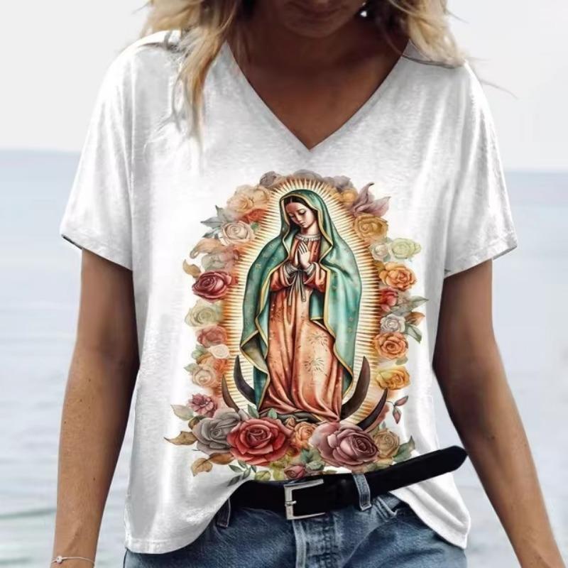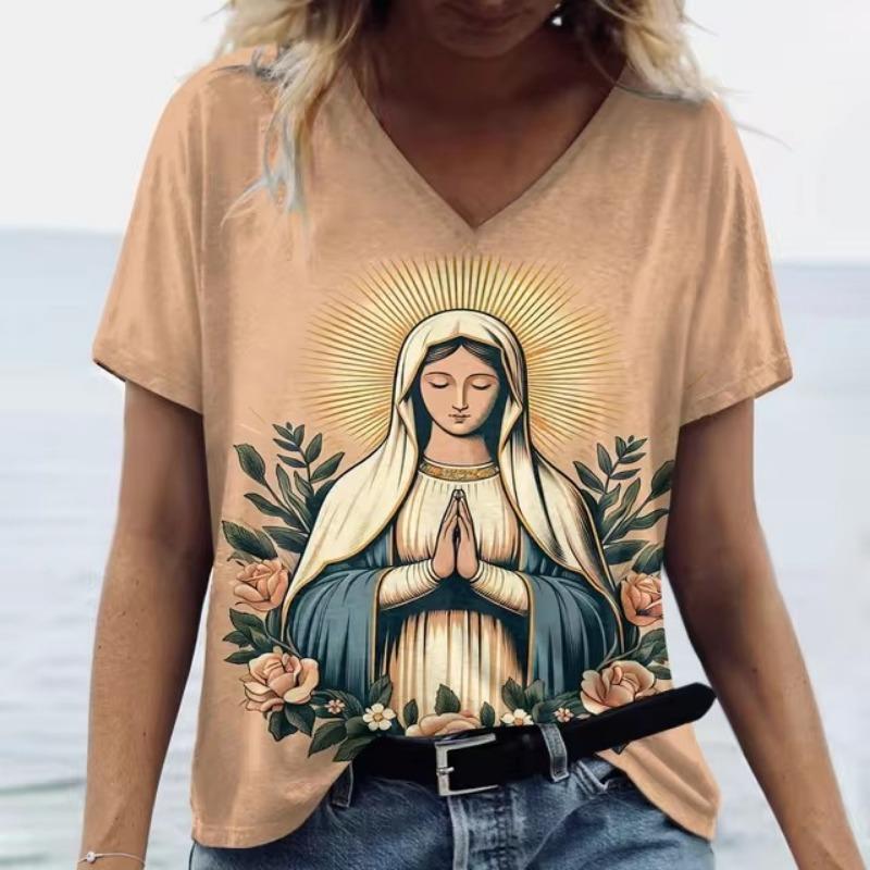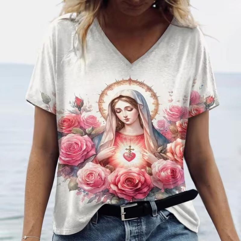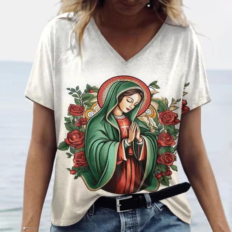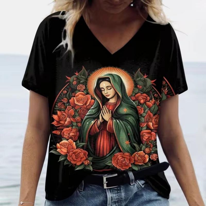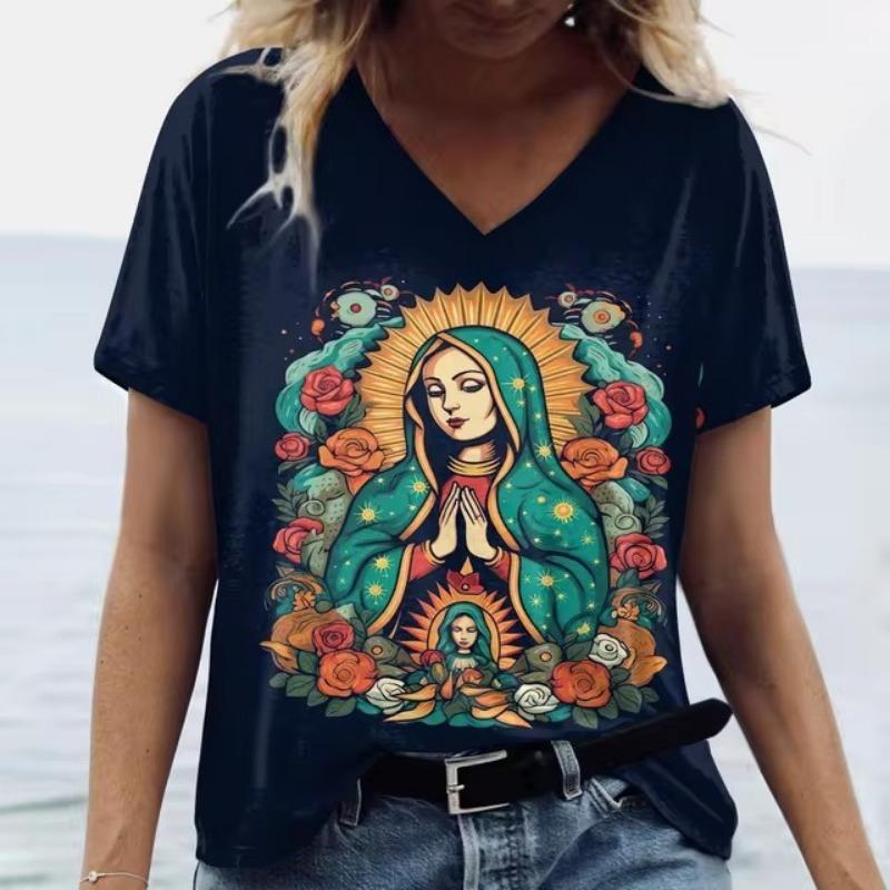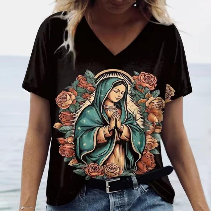 Летние женские футболки с принтом Девы Марии, большие размеры, топ с V-образным вырезом, блузка, женская рубашка, женская одежда больших размеров