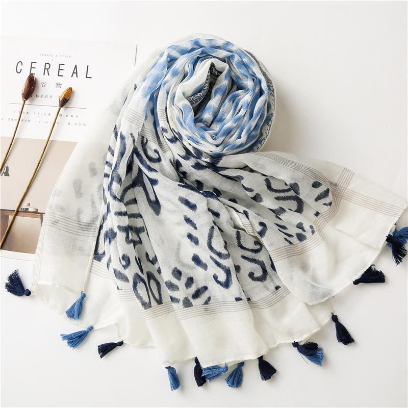 Harajuku Wind Японский лес Женский рифленый печатный узор Солнцезащитный платок шарф Пляжный шарф Хлопок пенька кисточка Шелковый шарф для женщин
