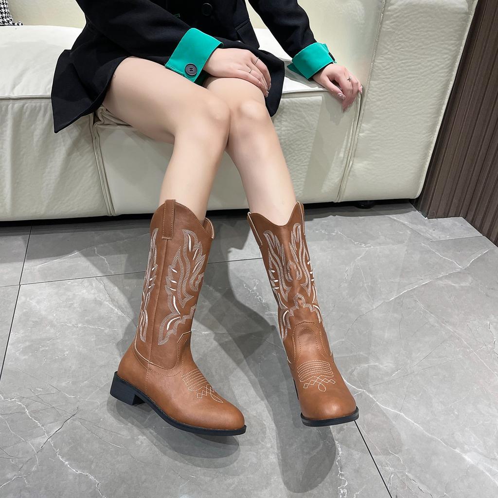 2024 Ковбойские сапоги в стиле вестерн, универсальные ботинки для взрослых женщин, мотоциклетные ботинки с вышитыми рукавами, сапоги до середины голени