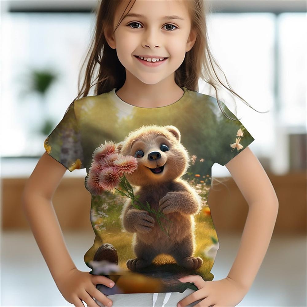 Футболка с принтом милого медведя 3D для девочек, милые футболки с изображением животных из мультфильмов для девочек, детская подарочная футболка с коротким рукавом, повседневный топ, детская одежда