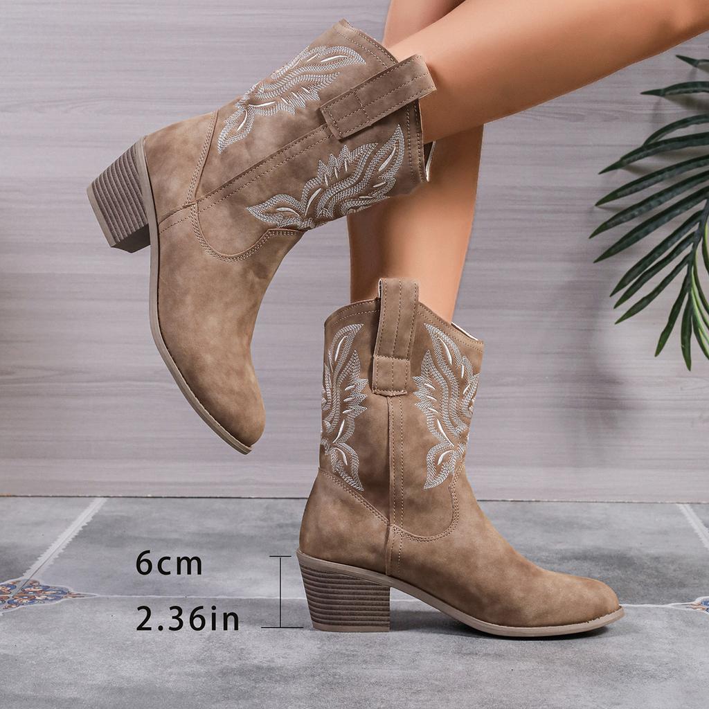 Осенние женские сапоги в стиле вестерн с острым носком и толстым каблуком, новые римские вышитые сапоги до середины голени для женщин, обувь на каблуке, женские сапоги