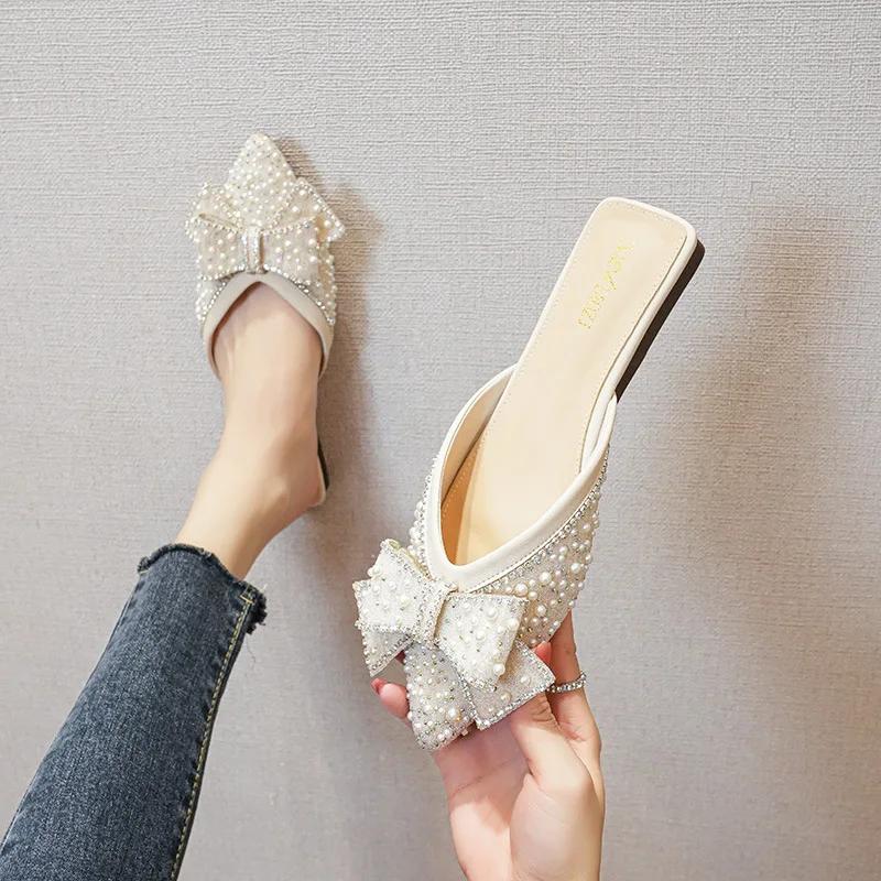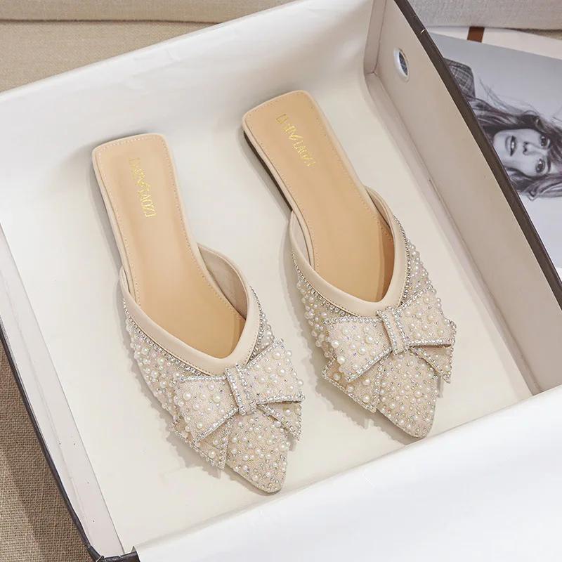 Модная роскошная женская летняя верхняя одежда 2024 года, новые повседневные тапочки с плоской подошвой Water Diamond Lazy Man Baotou, крутые тапочки большого размера 43