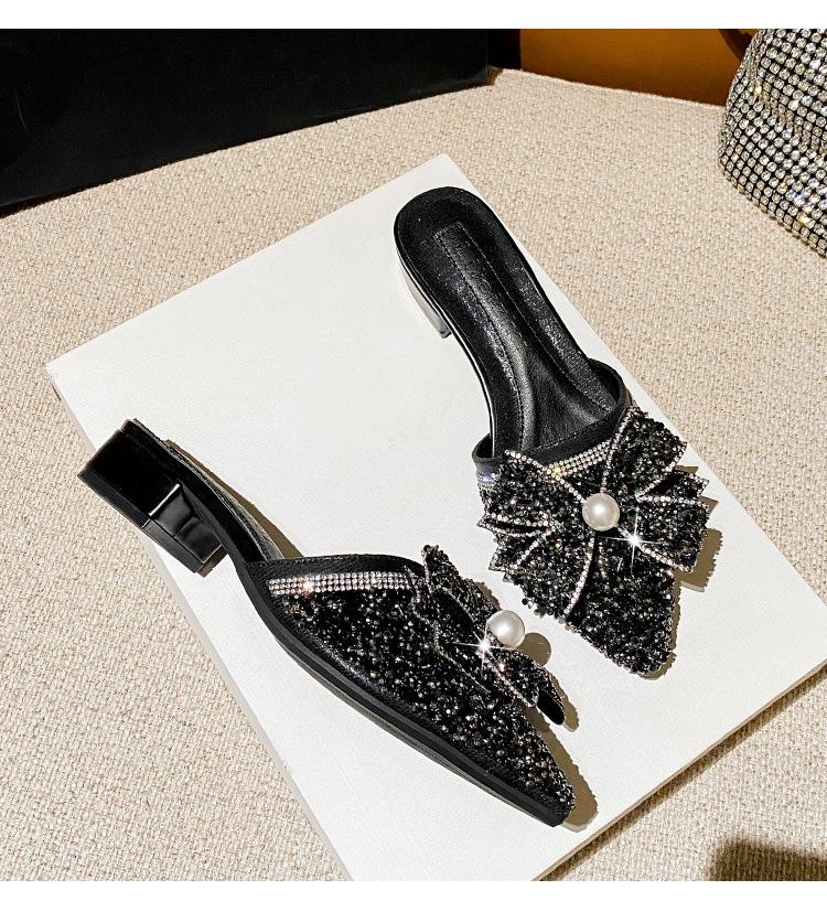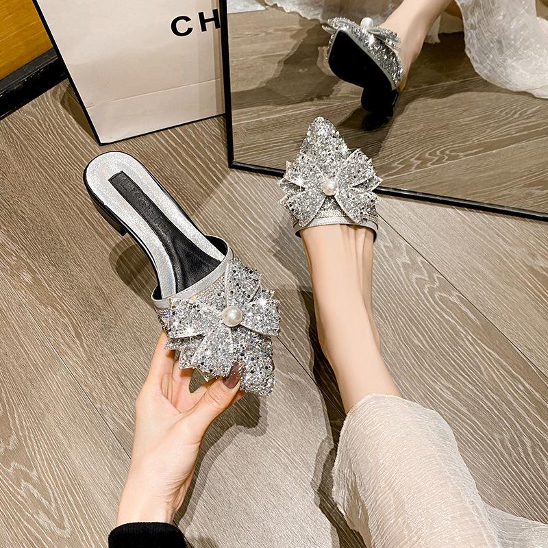 2024 Летняя новая обувь для женщин Красивые тапочки для девочек с бантом и жемчугом Повседневные сандалии для девочек на каблуках Мюли Туфли