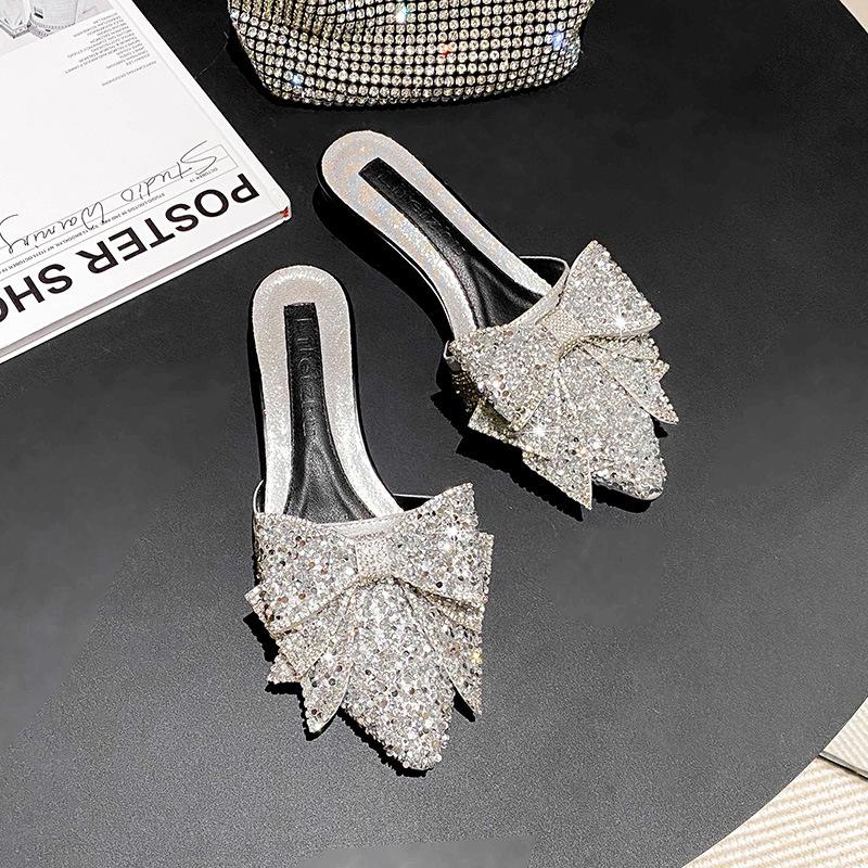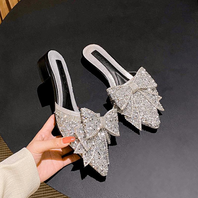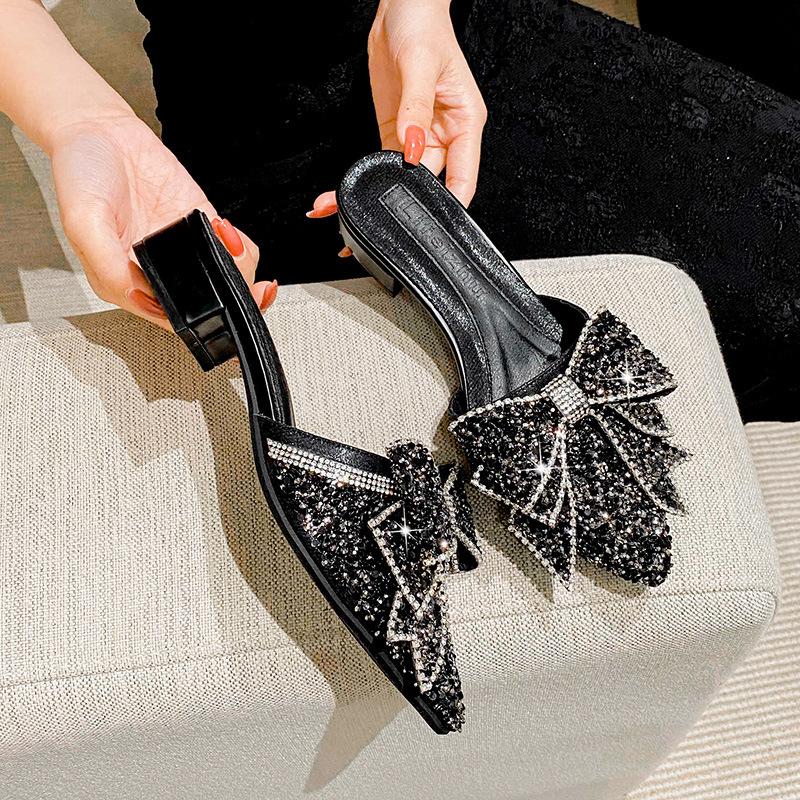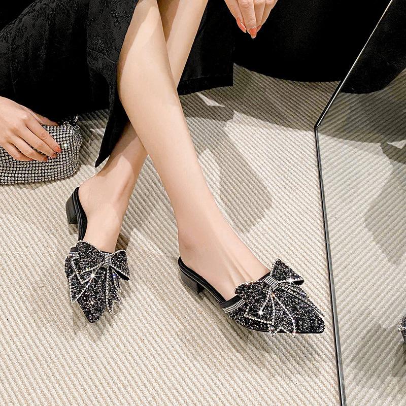 2024 Летняя новая обувь для женщин с острым носком, тапочки для девочек, блестящие банты, повседневные сандалии для девочек, каблуки, мюли, обувь для девочек