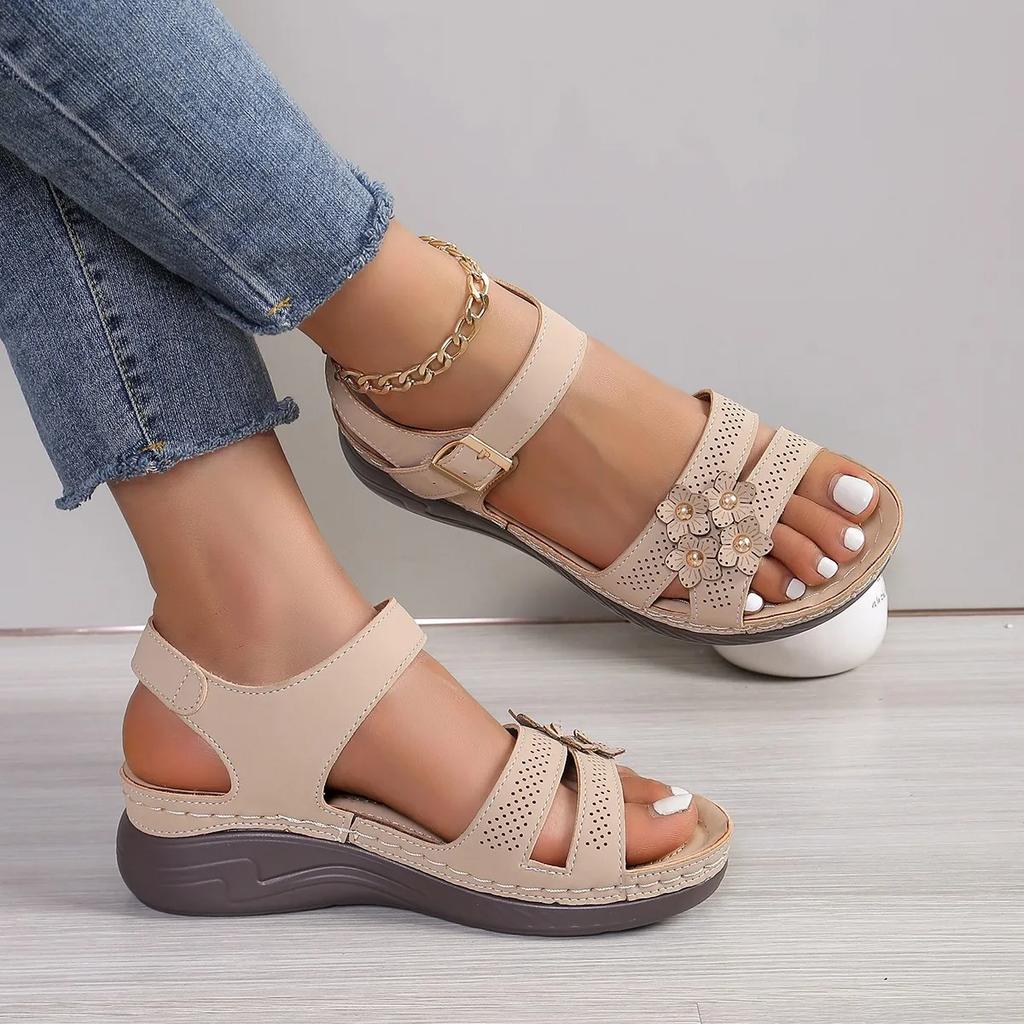 Женские босоножки на танкетке 2024 года, летние туфли в стиле ретро с открытым носком и цветами на платформе для женщин, повседневная пляжная обувь для отдыха, женские сандалии