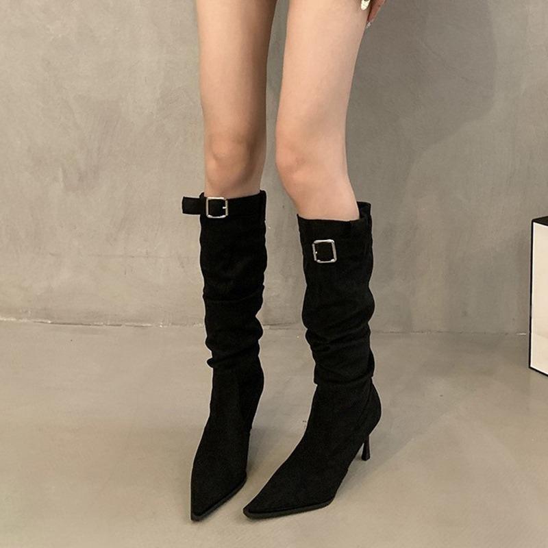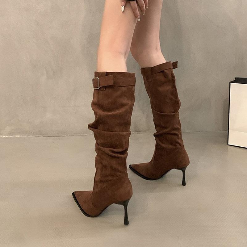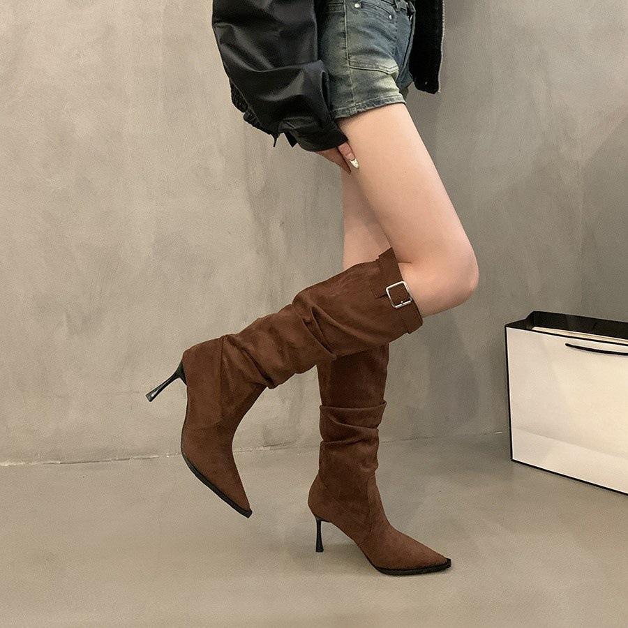 Плиссированные женские сапоги до колена с острым носком на высоком каблуке, женская обувь весна-осень, замшевые модные однотонные сапоги-рыцари