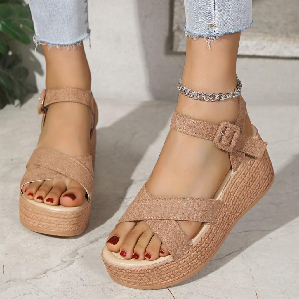 Модные женские босоножки на танкетке 2024 года, летние новые модные повседневные туфли на платформе с открытым носком, резиновая подошва, элегантные босоножки на каблуках