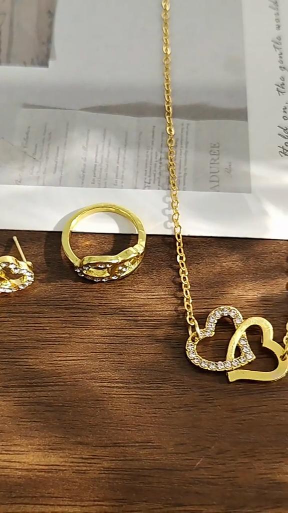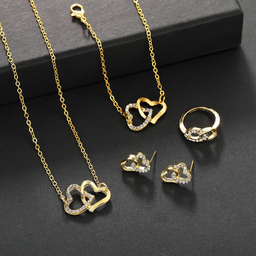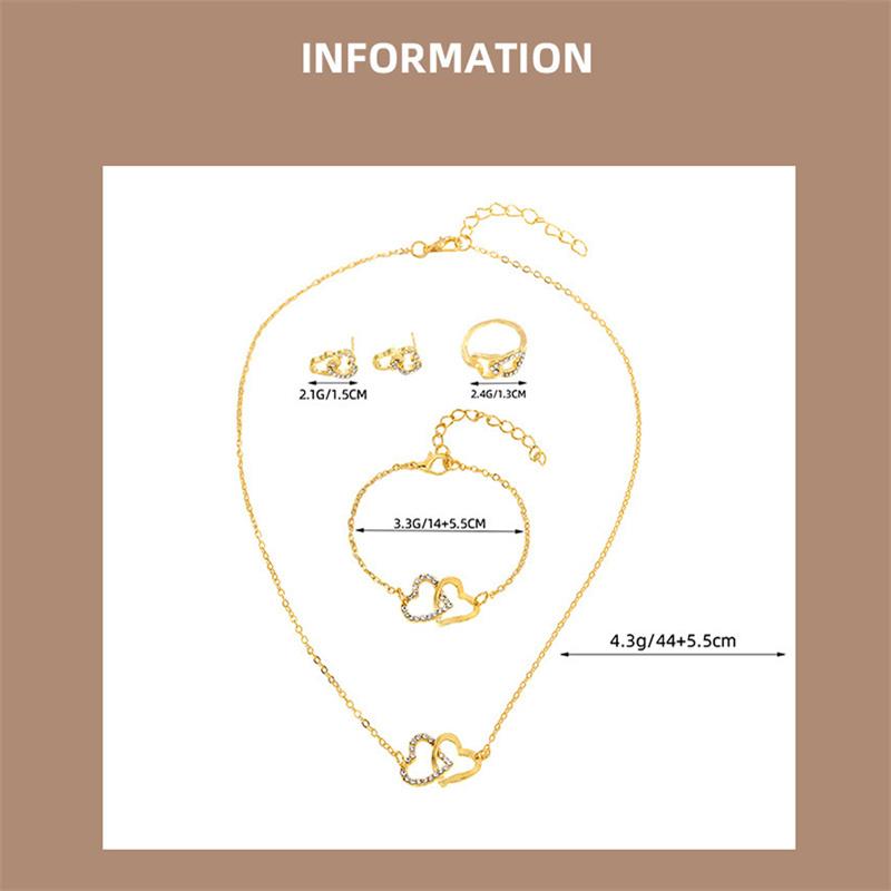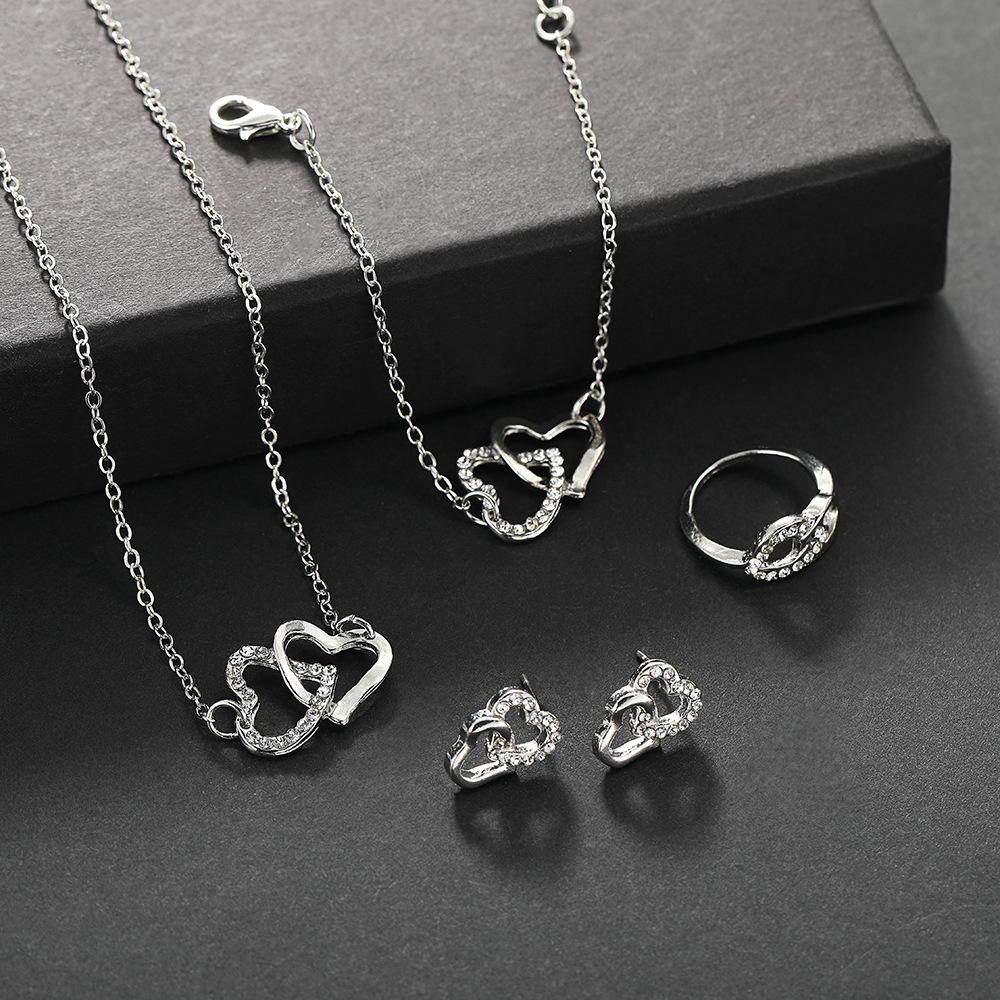Ожерелье + браслет + серьга-гвоздик + кольцо для пальца 4 шт./компл. Двойное сердце Геометрия Ювелирные изделия Мода Простой женский подарок Свадебные аксессуары