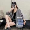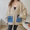 WTEMPO Свободный сплайсированный кардиган женский открытый спереди свитер длинный рукав V-образный вырез трикотажное женское пальто с карманом из денима в стиле пэчворк