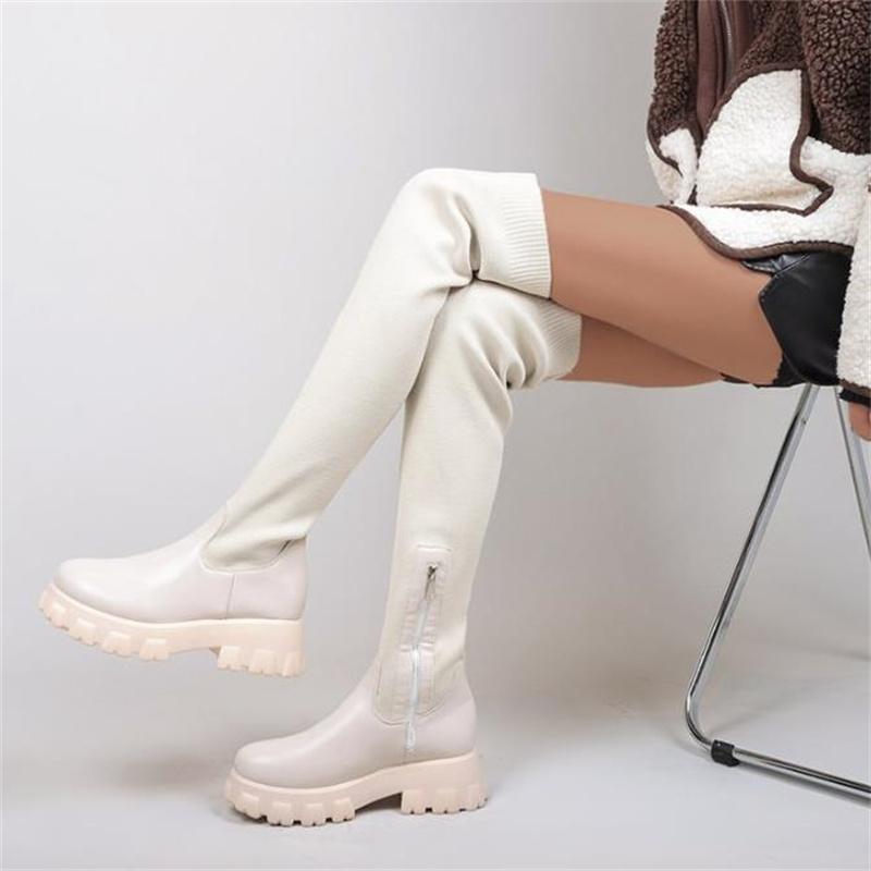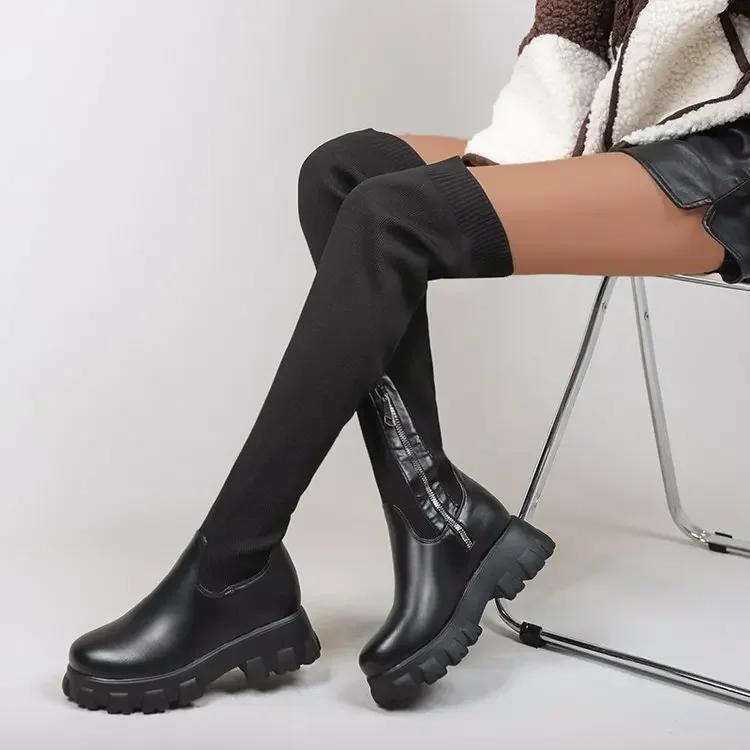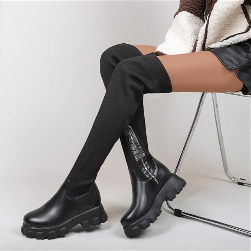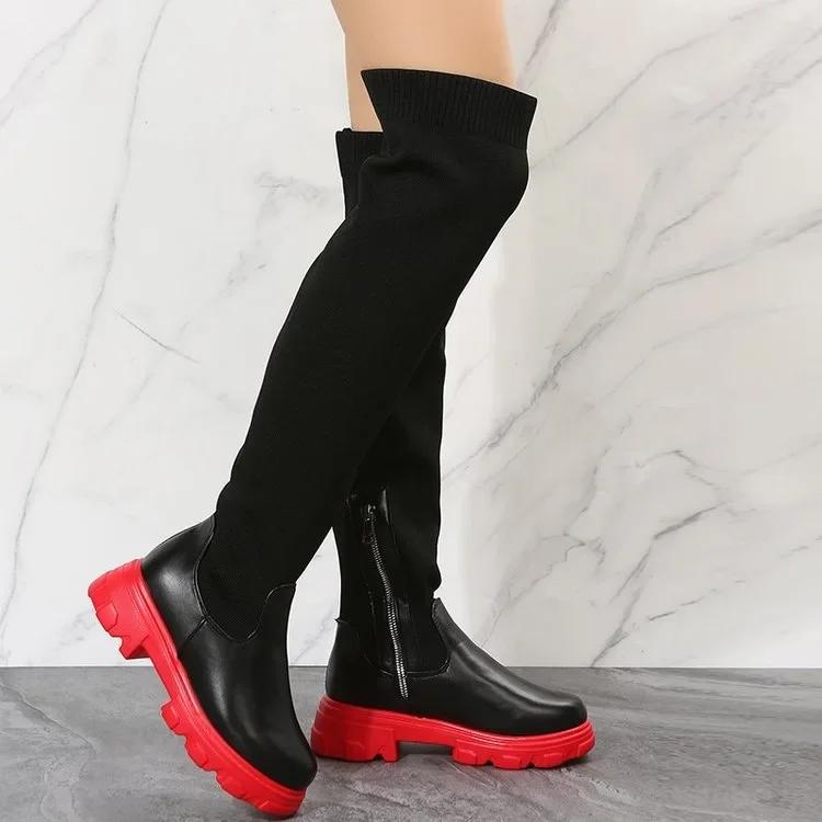 Модные ретро-сапоги до бедра, женские туфли выше колена на платформе, вязаные эластичные носки, ботинки, массивные, новые, Botas Mujer, большие размеры