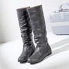 Модные женские кожаные сапоги, модные плиссированные высокие сапоги на танкетке с круглым носком, осенне-зимние однотонные туфли без застежек, женские высокие черные кожаные сапоги