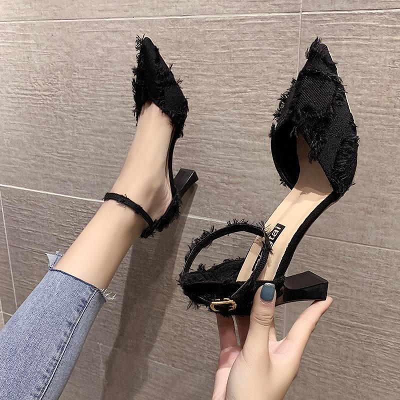Fashion Coarse heeled high heels for women new spring pointed hollow temperament single buckle strap fairy style follow-up shoes
