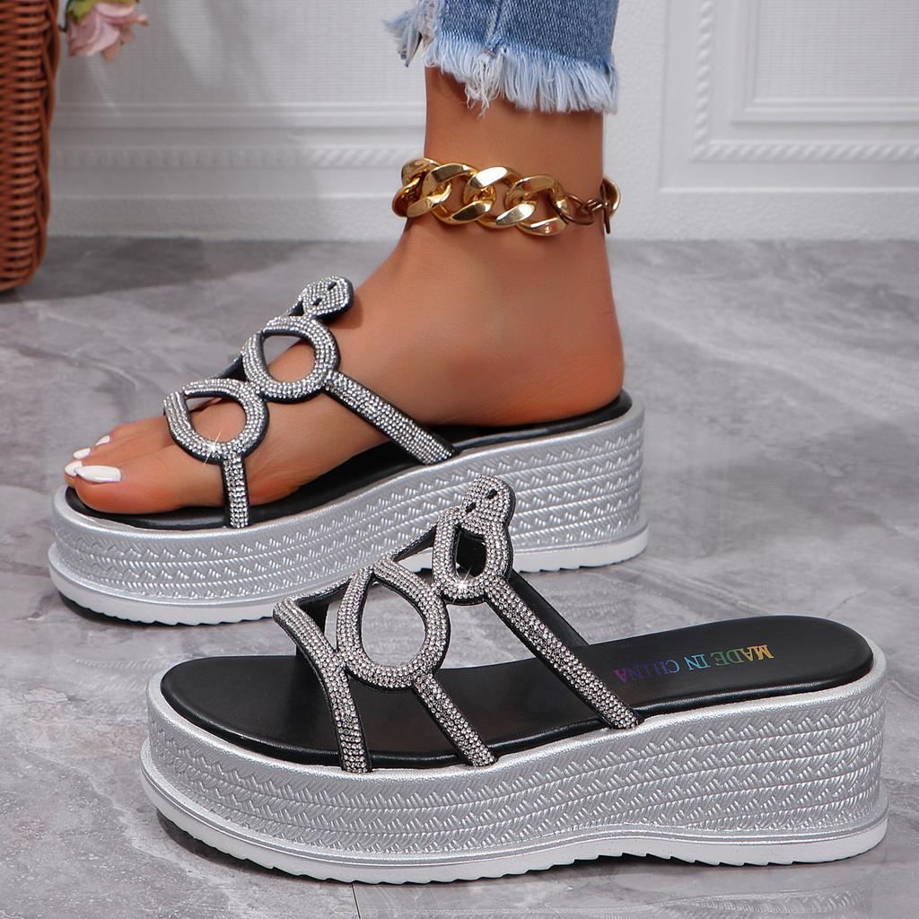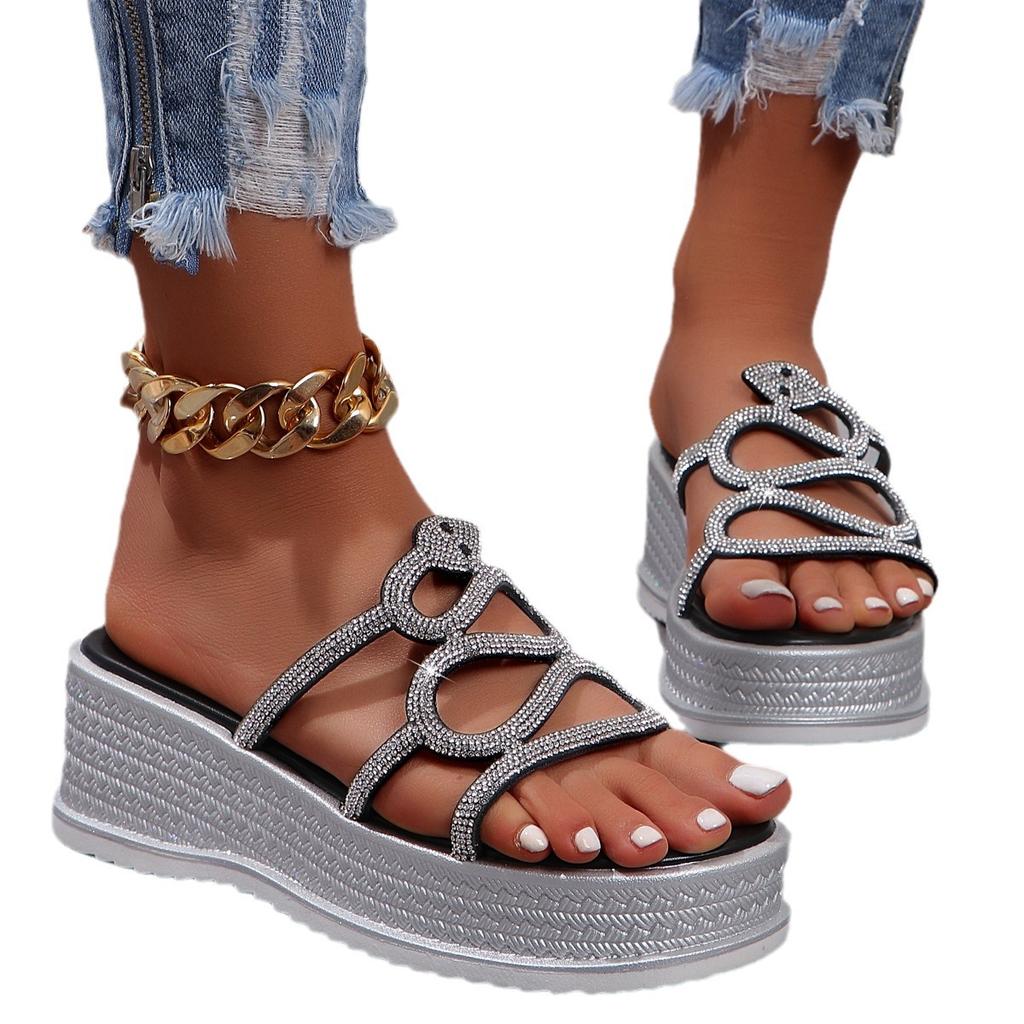 Модные женские тапочки. Сандалии с покатым каблуком, женские новые летние пляжные шлепанцы 2024 года в стиле змеи и бриллиантов.