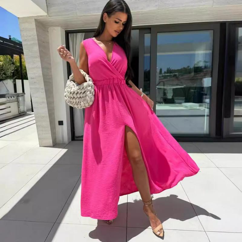 Летнее однотонное платье с V-образным вырезом, сексуальное, темпераментное, с разрезом и высокой талией, длинное для женщин