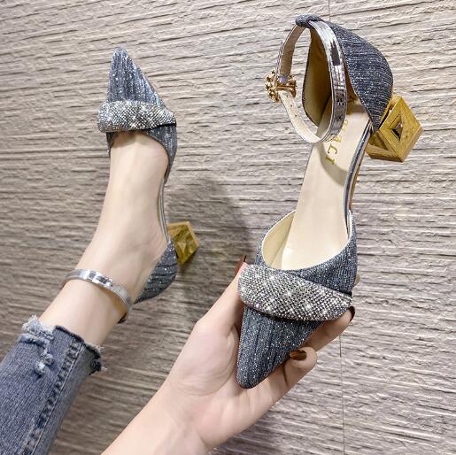 Модные женские босоножки с острым носком весна-лето новые модные туфли с острым носком и надписью на толстом каблуке высокие женские босоножки P630