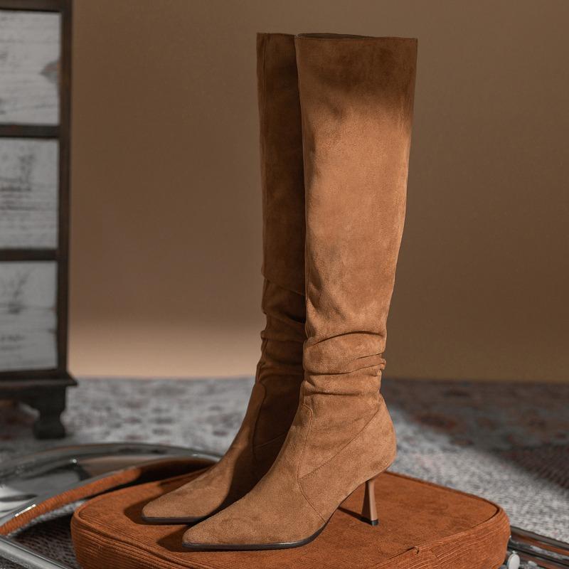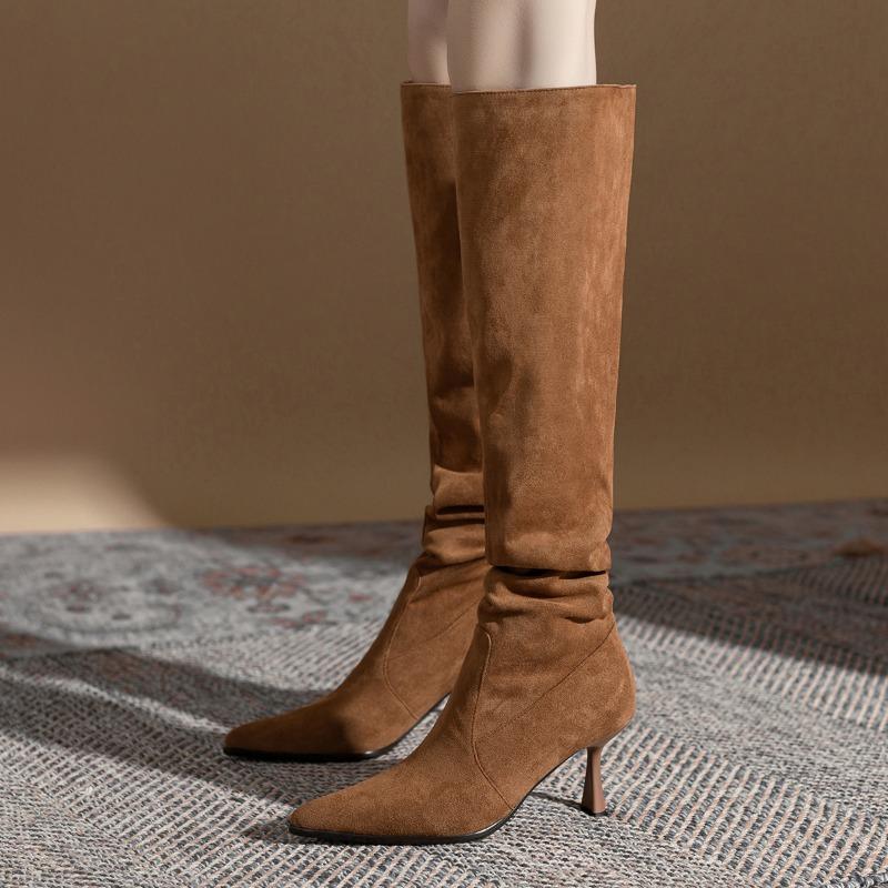 Модные осенне-зимние сапоги выше колена с длинным рукавом в стиле ретро, женские новые замшевые сапоги на высоком каблуке, остроносые сапоги на тонком каблуке