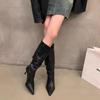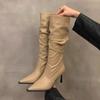 Мода 2024 Осень Новые женские сапоги с острым носком и плиссировкой Модные сапоги до колена на высоком каблуке