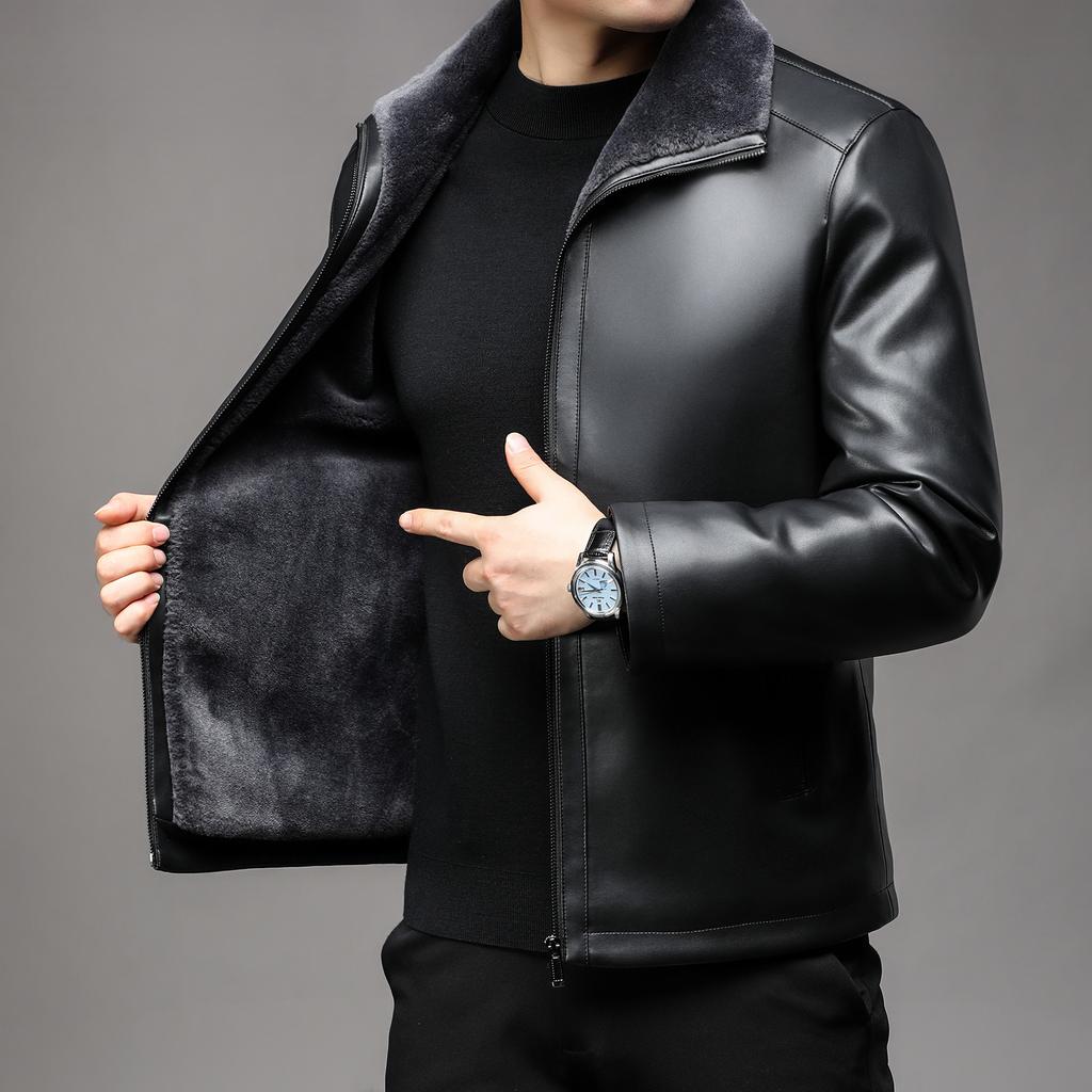 Кожаная куртка Зимняя кожаная куртка Деловая теплая с воротником-лацканами Меховая интегрированная флисовая утолщенная кожаная куртка